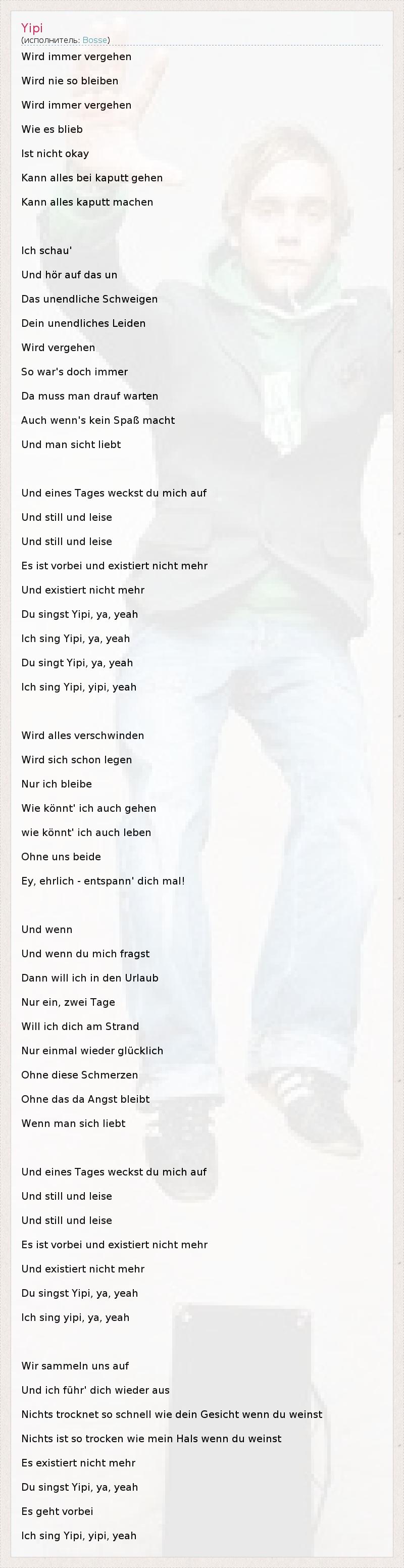 Это интересно:Two bands sharing the name BOSSE.1. Bosse - a Minimalism Acoustic one-man band from New York, USA. There is currently a new album, Echoes of the Forgotten, released by Those Opposed Records.http://www.myspace.com/bossearthttp://www.those-opposed-recs.fr.nf/__________________________________2. Bosse - a german rock Band from Braunschweig. Their label is EMI.Bosse got their name by their singer and former “Hyperchild”-member Axel Bosse. Further members of Bosse are Björn Krüger (drums), Thorsten Sala (guitar) und Theofilos Fotiades... продолжение