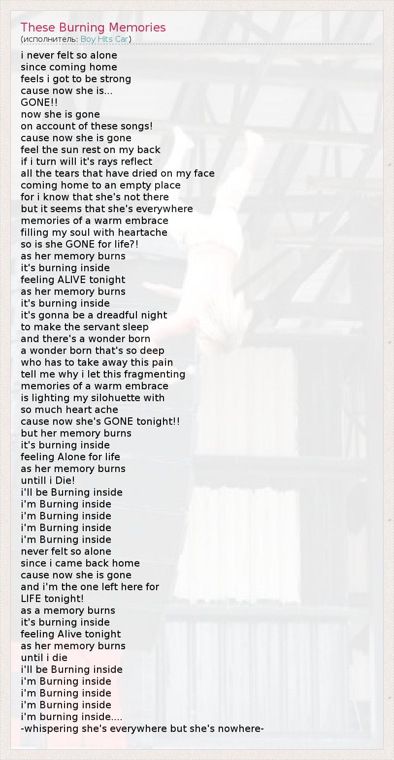 i never felt so alone since coming home feels i got to be strong cause now she is... GONE!! now she is gone on account of these songs! cause now she is gone feel the sun rest on my back if i turn will it's rays reflect all the tears that have dried on my face coming home to an empty place for i know that she's not there but it seems that she's everywhere memories of a warm embrace filling my soul with heartache so is she GONE for life?! as her memory burns it's burning inside feeling ALIVE tonight as her memory burns it's burning inside it's gonna be a dreadful night to make the servant sleep and there's a wonder born a wonder born that's so deep who has to take away this pain tell me why i let this fragmenting memories of a warm embrace is lighting my silohuette with so much heart ache cause now she's GONE tonight!! but her memory burns it's burning inside feeling Alone for life as her memory burns untill i Die! i'll be Burning inside i'm Burning inside i'm Burning inside i'm Burning inside i'm Burning inside never felt so alone since i came back home cause now she is gone and i'm the one left here for LIFE tonight! as a memory burns it's burning inside feeling Alive tonight as her memory burns until i die i'll be Burning inside i'm Burning inside i'm Burning inside i'm Burning inside i'm burning inside.... -whispering she's everywhere but she's nowhere-