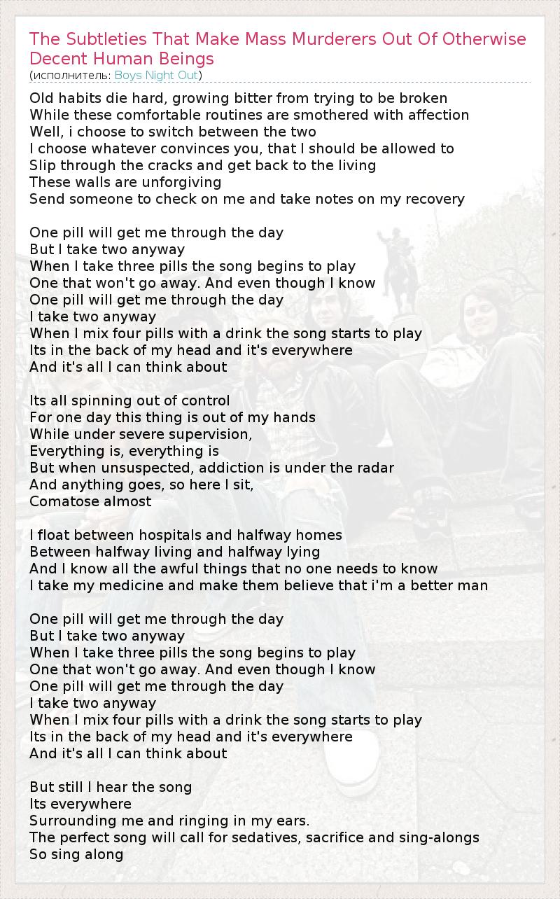 ГлавнаяИсполнителиBoys Night OutThe Subtleties That Make Mass Murderers Out Of Otherwise Decent Human Beings