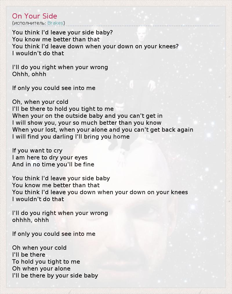 You think I'd leave your side baby? You know me better than that You think I'd leave down when your down on your knees? I wouldn't do that I'll do you right when your wrong Ohhh, ohhh If only you could see into me Oh, when your cold I'll be there to hold you tight to me When your on the outside baby and you can't get in I will show you, your so much better than you know When your lost, when your alone and you can't get back again I will find you darling I'll bring you home If you want to cry I am here to dry your eyes And in no time you'll be fine You think I'd leave your side baby You know me better than that You think I'd leave you down when your down on your knees I wouldn't do that I'll do you right when your wrong ohhhh, ohhh If only you could see into me Oh when your cold I'll be there To hold you tight to me Oh when your alone I'll be there by your side baby