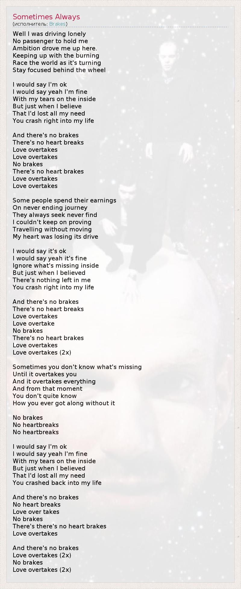 Well I was driving lonely No passenger to hold me Ambition drove me up here. Keeping up with the burning Race the world as it's turning Stay focused behind the wheel I would say I'm ok I would say yeah I'm fine With my tears on the inside But just when I believe That I'd lost all my need You crash right into my life And there's no brakes There's no heart breaks Love overtakes Love overtakes No brakes There's no heart brakes Love overtakes Love overtakes Some people spend their earnings On never ending journey They always seek never find I couldn't keep on proving Travelling without moving My heart was losing its drive I would say it's ok I would say yeah it's fine Ignore what's missing inside But just when I believed There's nothing left in me You crash right into my life And there's no brakes There's no heart breaks Love overtakes Love overtake No brakes There's no heart brakes Love overtakes Love overtakes (2x) Sometimes you don't know what's missing Until it overtakes you And it overtakes everything And from that moment You don't quite know How you ever got along without it No brakes No heartbreaks No heartbreaks I would say I'm ok I would say yeah I'm fine With my tears on the inside But just when I believed That I'd lost all my need You crashed back into my life And there's no brakes No heart breaks Love over takes No brakes There's there's no heart brakes Love overtakes And there's no brakes Love overtakes (2x) No brakes Love overtakes (2x)