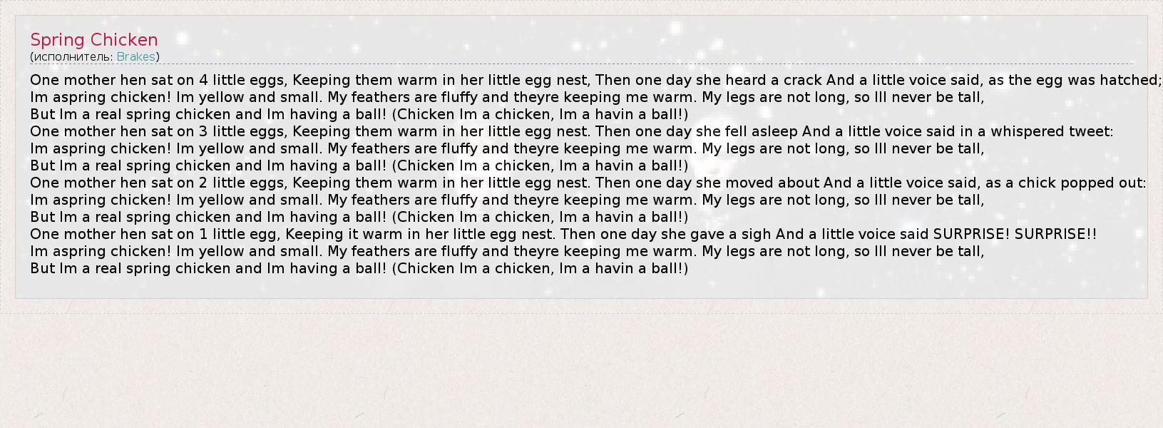 One mother hen sat on 4 little eggs, Keeping them warm in her little egg nest, Then one day she heard a crack And a little voice said, as the egg was hatched; Im aspring chicken! Im yellow and small. My feathers are fluffy and theyre keeping me warm. My legs are not long, so Ill never be tall, But Im a real spring chicken and Im having a ball! (Chicken Im a chicken, Im a havin a ball!) One mother hen sat on 3 little eggs, Keeping them warm in her little egg nest. Then one day she fell asleep And a little voice said in a whispered tweet: Im aspring chicken! Im yellow and small. My feathers are fluffy and theyre keeping me warm. My legs are not long, so Ill never be tall, But Im a real spring chicken and Im having a ball! (Chicken Im a chicken, Im a havin a ball!) One mother hen sat on 2 little eggs, Keeping them warm in her little egg nest. Then one day she moved about And a little voice said, as a chick popped out: Im aspring chicken! Im yellow and small. My feathers are fluffy and theyre keeping me warm. My legs are not long, so Ill never be tall, But Im a real spring chicken and Im having a ball! (Chicken Im a chicken, Im a havin a ball!) One mother hen sat on 1 little egg, Keeping it warm in her little egg nest. Then one day she gave a sigh And a little voice said SURPRISE! SURPRISE!! Im aspring chicken! Im yellow and small. My feathers are fluffy and theyre keeping me warm. My legs are not long, so Ill never be tall, But Im a real spring chicken and Im having a ball! (Chicken Im a chicken, Im a havin a ball!)