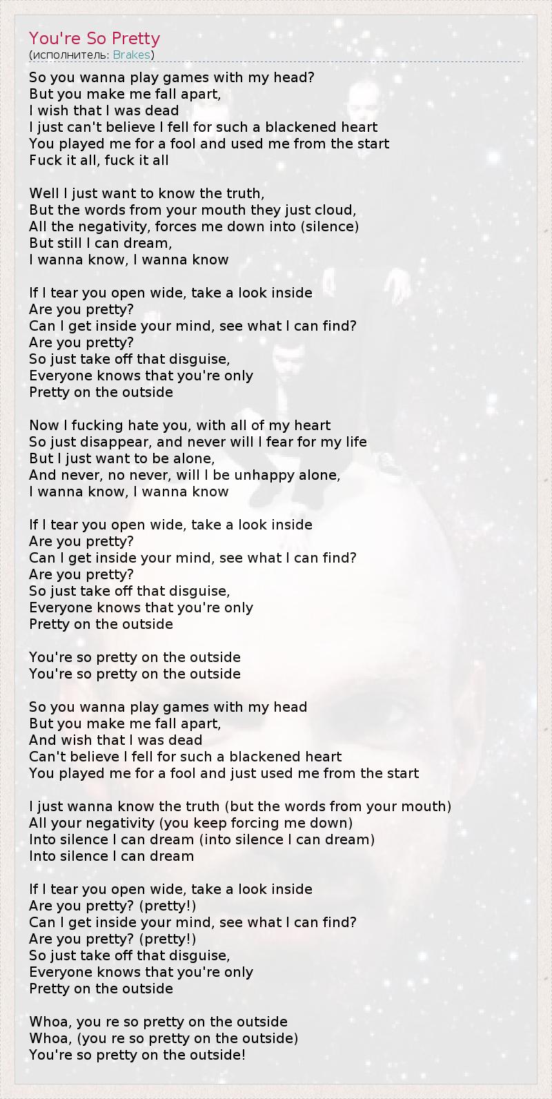 So you wanna play games with my head? But you make me fall apart, I wish that I was dead I just can't believe I fell for such a blackened heart You played me for a fool and used me from the start Fuck it all, fuck it all Well I just want to know the truth, But the words from your mouth they just cloud, All the negativity, forces me down into (silence) But still I can dream, I wanna know, I wanna know If I tear you open wide, take a look inside Are you pretty? Can I get inside your mind, see what I can find? Are you pretty? So just take off that disguise, Everyone knows that you're only Pretty on the outside Now I fucking hate you, with all of my heart So just disappear, and never will I fear for my life But I just want to be alone, And never, no never, will I be unhappy alone, I wanna know, I wanna know If I tear you open wide, take a look inside Are you pretty? Can I get inside your mind, see what I can find? Are you pretty? So just take off that disguise, Everyone knows that you're only Pretty on the outside You're so pretty on the outside You're so pretty on the outside So you wanna play games with my head But you make me fall apart, And wish that I was dead Can't believe I fell for such a blackened heart You played me for a fool and just used me from the start I just wanna know the truth (but the words from your mouth) All your negativity (you keep forcing me down) Into silence I can dream (into silence I can dream) Into silence I can dream If I tear you open wide, take a look inside Are you pretty? (pretty!) Can I get inside your mind, see what I can find? Are you pretty? (pretty!) So just take off that disguise, Everyone knows that you're only Pretty on the outside Whoa, you re so pretty on the outside Whoa, (you re so pretty on the outside) You're so pretty on the outside!