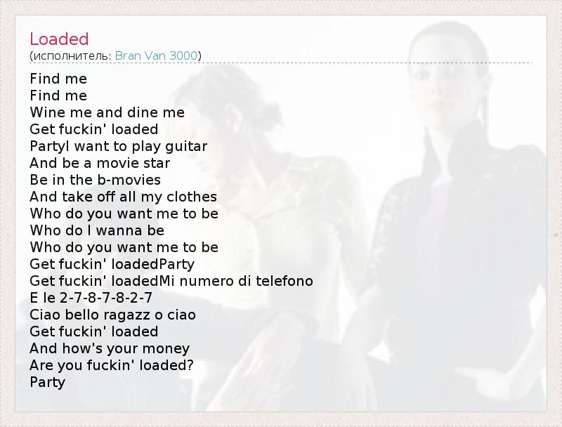 Это интересно:Bran Van 3000 (also known as Bran Van and BV3) is an electronica collective from Montreal, Canada. Founded by DJ James Di Salvio and E.P. Bergen, they collaborated on a number of songs with Stéphane Moraille, Sara Johnston, Steve "Liquid" Hawley, Jayne Hill, Québécois rock star Jean Leloup and other musicians.HistoryJames Di Salvio and E.P. Bergen got together in Manhattan and coined Bran Van 3000 in 1994. Di Salvio was a video director and asked E.P. to come teach him how to produce tracks with a sampler and turntables. Together they went and bought studio equipment in Times Square. E.P. returned to Montreal and immediately co-wrote/produced a single with Jean Leloup called:... продолжение