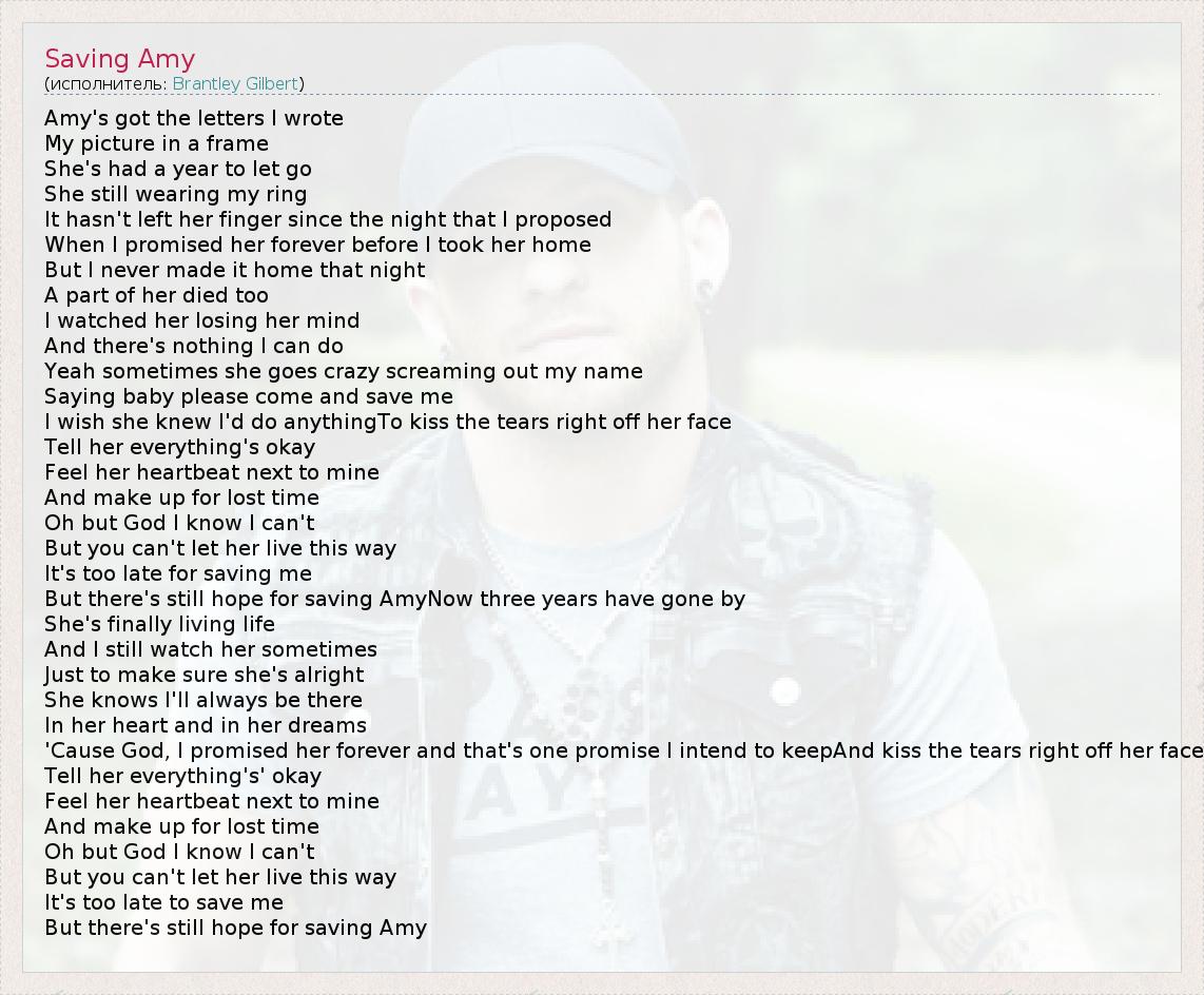 Amy's got the letters I wrote My picture in a frame She's had a year to let go She still wearing my ring It hasn't left her finger since the night that I proposed When I promised her forever before I took her home But I never made it home that night A part of her died too I watched her losing her mind And there's nothing I can do Yeah sometimes she goes crazy screaming out my name Saying baby please come and save me I wish she knew I'd do anythingTo kiss the tears right off her face Tell her everything's okay Feel her heartbeat next to mine And make up for lost time Oh but God I know I can't But you can't let her live this way It's too late for saving me But there's still hope for saving AmyNow three years have gone by She's finally living life And I still watch her sometimes Just to make sure she's alright She knows I'll always be there In her heart and in her dreams 'Cause God, I promised her forever and that's one promise I intend to keepAnd kiss the tears right off her face Tell her everything's' okay Feel her heartbeat next to mine And make up for lost time Oh but God I know I can't But you can't let her live this way It's too late to save me But there's still hope for saving Amy