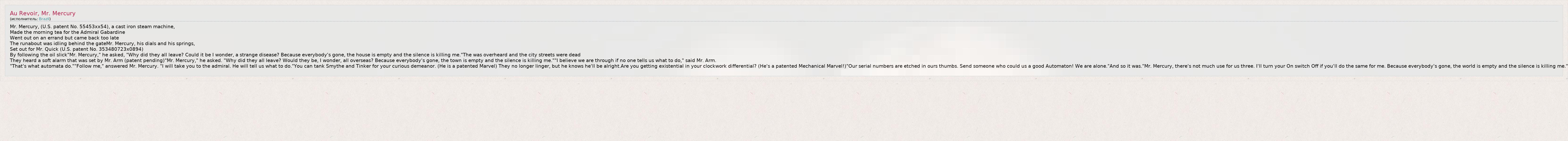 "That's what automata do.""Follow me," answered Mr. Mercury. "I will take you to the admiral. He will tell us what to do."You can tank Smythe and Tinker for your curious demeanor. (He is a patented Marvel) They no longer linger, but he knows he'll be alright.Are you getting existential in your clockwork differential? (He's a patented Mechanical Marvel!)"Our serial numbers are etched in ours thumbs. Send someone who could us a good Automaton! We are alone."And so it was."Mr. Mercury, there's not much use for us three. I'll turn your On switch Off if you'll do the same for me. Because everybody's gone, the world is empty and the silence is killing me."