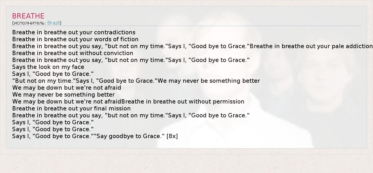 Breathe in breathe out you say, "but not on my time."Says I, "Good bye to Grace."Breathe in breathe out your pale addiction