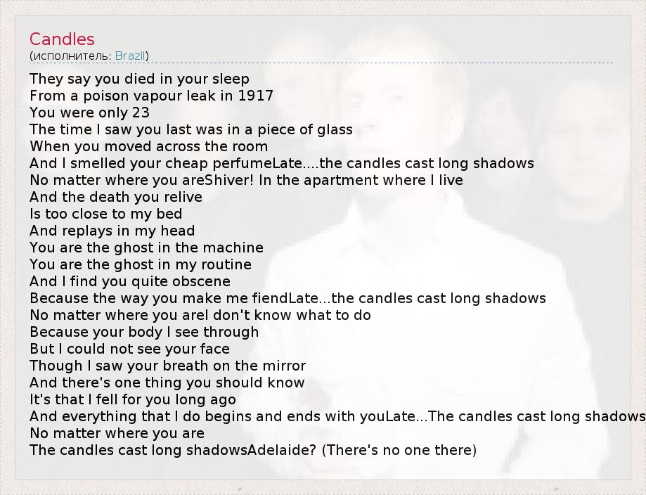 And I smelled your cheap perfumeLate....the candles cast long shadows