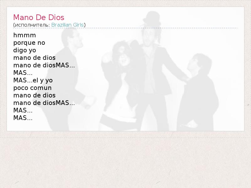 А как ты думаешь, о чем песня "Mano De Dios" ?
