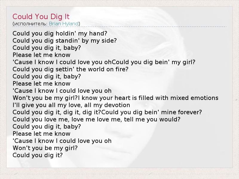 Could you dig holdin' my hand? Could you dig standin' by my side? Could you dig it, baby? Please let me know 'Cause I know I could love you ohCould you dig bein' my girl? Could you dig settin' the world on fire? Could you dig it, baby? Please let me know 'Cause I know I could love you oh Won't you be my girl?I know your heart is filled with mixed emotions I'll give you all my love, all my devotion Could you dig it, dig it, dig it?Could you dig bein' mine forever? Could you love me, love me love me, tell me you would? Could you dig it, baby? Please let me know 'Cause I know I could love you oh Won't you be my girl? Could you dig it?