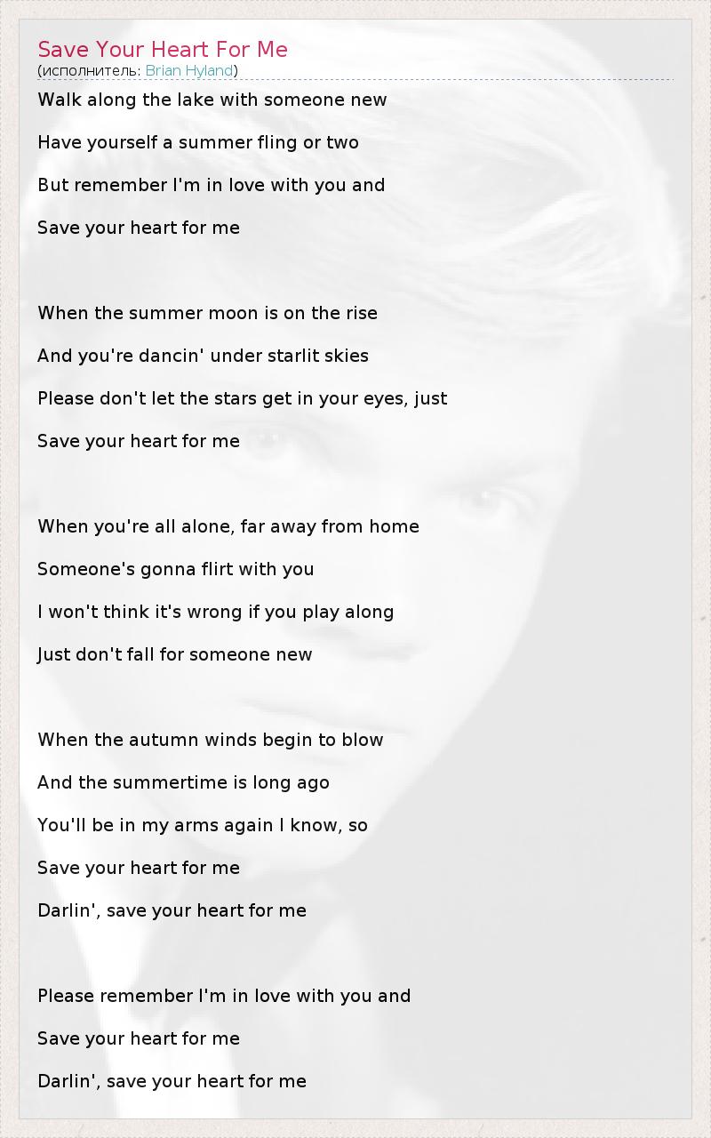 Walk along the lake with someone new Have yourself a summer fling or two But remember I'm in love with you and Save your heart for me When the summer moon is on the rise And you're dancin' under starlit skies Please don't let the stars get in your eyes, just Save your heart for me When you're all alone, far away from home Someone's gonna flirt with you I won't think it's wrong if you play along Just don't fall for someone new When the autumn winds begin to blow And the summertime is long ago You'll be in my arms again I know, so Save your heart for me Darlin', save your heart for me Please remember I'm in love with you and Save your heart for me Darlin', save your heart for me