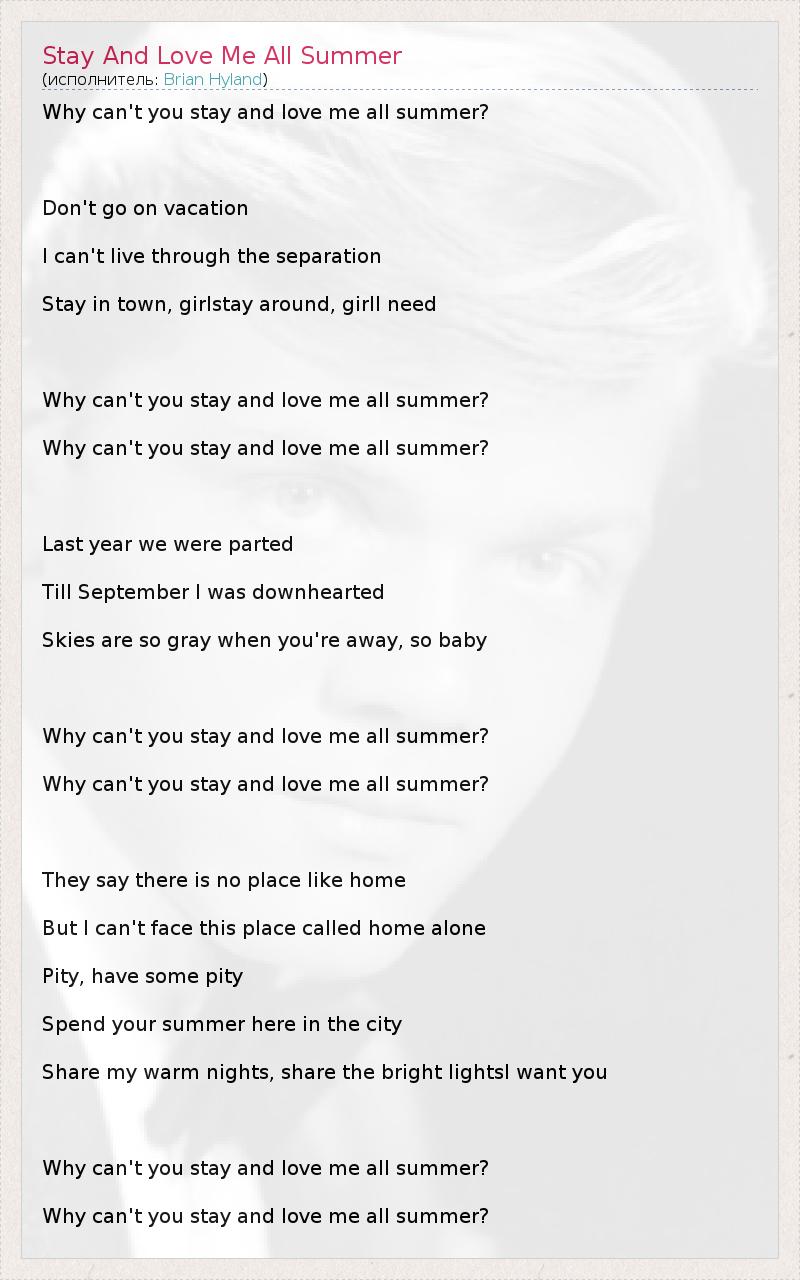 Why can't you stay and love me all summer? Don't go on vacation I can't live through the separation Stay in town, girlstay around, girlI need Why can't you stay and love me all summer? Why can't you stay and love me all summer? Last year we were parted Till September I was downhearted Skies are so gray when you're away, so baby Why can't you stay and love me all summer? Why can't you stay and love me all summer? They say there is no place like home But I can't face this place called home alone Pity, have some pity Spend your summer here in the city Share my warm nights, share the bright lightsI want you Why can't you stay and love me all summer? Why can't you stay and love me all summer?