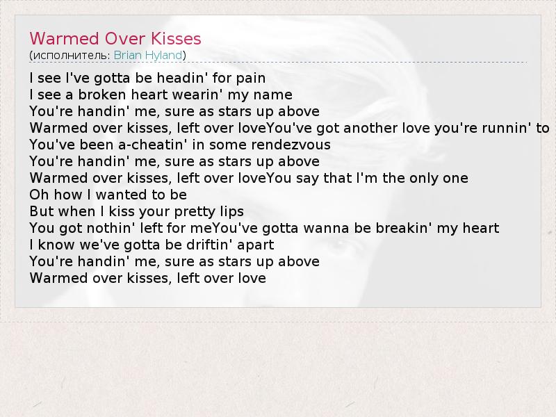 I see I've gotta be headin' for pain I see a broken heart wearin' my name You're handin' me, sure as stars up above Warmed over kisses, left over loveYou've got another love you're runnin' to You've been a-cheatin' in some rendezvous You're handin' me, sure as stars up above Warmed over kisses, left over loveYou say that I'm the only one Oh how I wanted to be But when I kiss your pretty lips You got nothin' left for meYou've gotta wanna be breakin' my heart I know we've gotta be driftin' apart You're handin' me, sure as stars up above Warmed over kisses, left over love