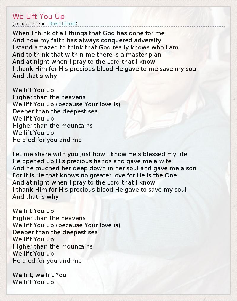 When I think of all things that God has done for me And now my faith has always conquered adversity I stand amazed to think that God really knows who I am And to think that within me there is a master plan And at night when I pray to the Lord that I know I thank Him for His precious blood He gave to me save my soul And that's why We lift You up Higher than the heavens We lift You up (because Your love is) Deeper than the deepest sea We lift You up Higher than the mountains We lift You up He died for you and me Let me share with you just how I know He's blessed my life He opened up His precious hands and gave me a wife And he touched her deep down in her soul and gave me a son For it is He that knows no greater love for He is the One And at night when I pray to the Lord that I know I thank Him for His precious blood He gave to save my soul And that is why We lift You up Higher than the heavens We lift You up (because Your love is) Deeper than the deepest sea We lift You up Higher than the mountains We lift You up He died for you and me We lift, we lift You We lift You up
