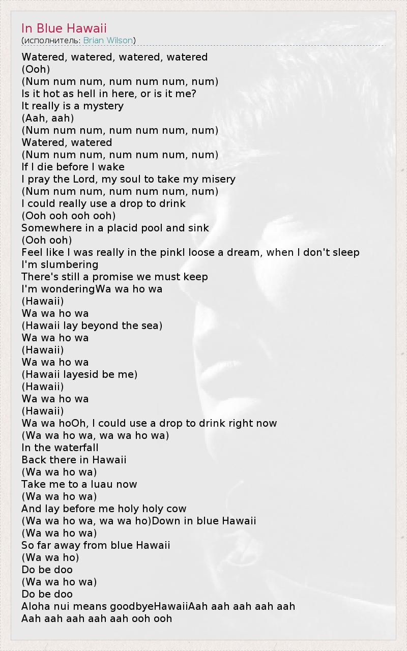Watered, watered, watered, watered (Ooh) (Num num num, num num num, num) Is it hot as hell in here, or is it me? It really is a mystery (Aah, aah) (Num num num, num num num, num) Watered, watered (Num num num, num num num, num) If I die before I wake I pray the Lord, my soul to take my misery (Num num num, num num num, num) I could really use a drop to drink (Ooh ooh ooh ooh) Somewhere in a placid pool and sink (Ooh ooh) Feel like I was really in the pinkI loose a dream, when I don't sleep I'm slumbering There's still a promise we must keep I'm wonderingWa wa ho wa (Hawaii) Wa wa ho wa (Hawaii lay beyond the sea) Wa wa ho wa (Hawaii) Wa wa ho wa (Hawaii layesid be me) (Hawaii) Wa wa ho wa (Hawaii) Wa wa hoOh, I could use a drop to drink right now (Wa wa ho wa, wa wa ho wa) In the waterfall Back there in Hawaii (Wa wa ho wa) Take me to a luau now (Wa wa ho wa) And lay before me holy holy cow (Wa wa ho wa, wa wa ho)Down in blue Hawaii (Wa wa ho wa) So far away from blue Hawaii (Wa wa ho) Do be doo (Wa wa ho wa) Do be doo Aloha nui means goodbyeHawaiiAah aah aah aah aah Aah aah aah aah aah ooh ooh