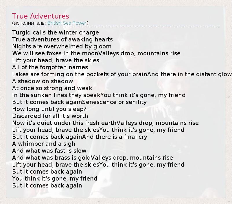 Это интересно:Группа British Sea Power была основана в 2000 году в Брайтоне. В этом же году вышла первая запись группы - сингл Fear of Drowning . Взлет популярности произошел сразу после выхода дебютного альбома The Decline of British Sea Power в 2003 году, в этом же году Sunday Times назвала British Sea Power лучшей группой Великобритании. Сочетание музыки в стиле арт-рок и оригинальных текстов с потрясающими живыми выступлениями делают British... продолжение