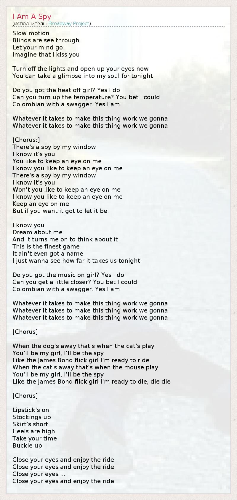 А как ты думаешь, о чем песня "I Am A Spy" ?