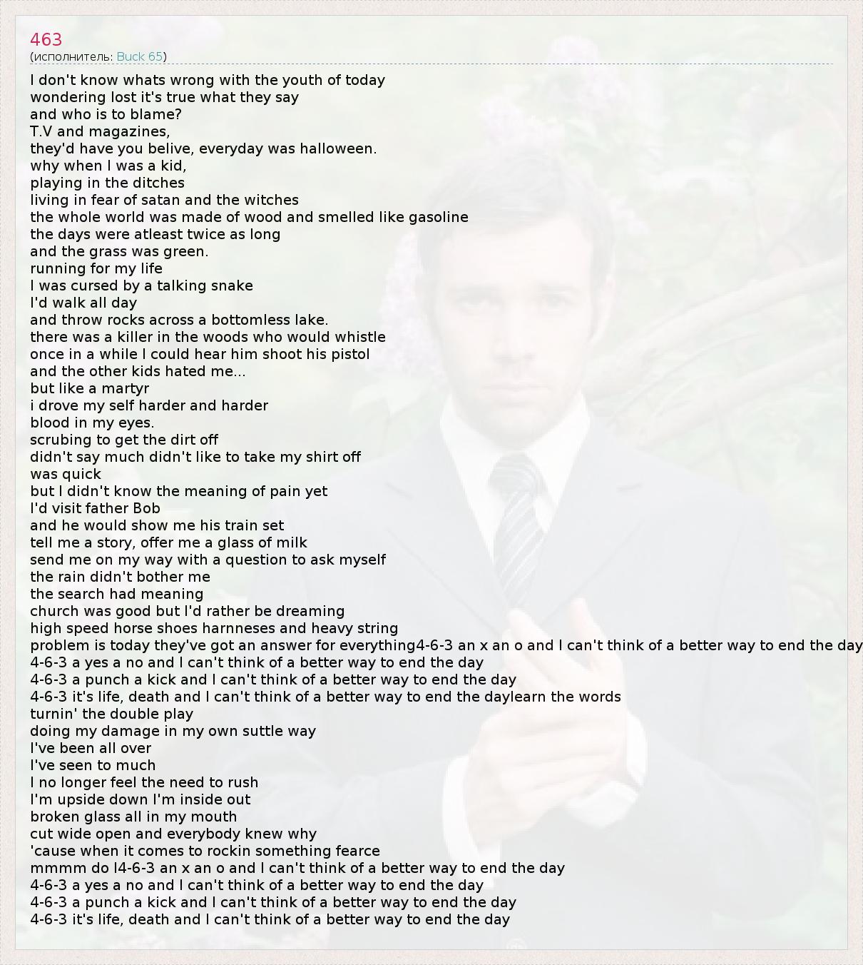 Это интересно:Richard Terfry (родился 4 марта 1972-го года), более известный под именем Buck 65 - легенда канадского хип-хопа. Его роль в развитии современной хип-хоп музыки сложно переоценить. Он стал одним из создетелей современного альтернативного и экспериментального хип-хопа. К тому же его эксперименты уходят далеко за пределы хип-хопа. Он экспериментирует с блюзом, кантри, роком, фолком и авангардом.Детство... продолжение