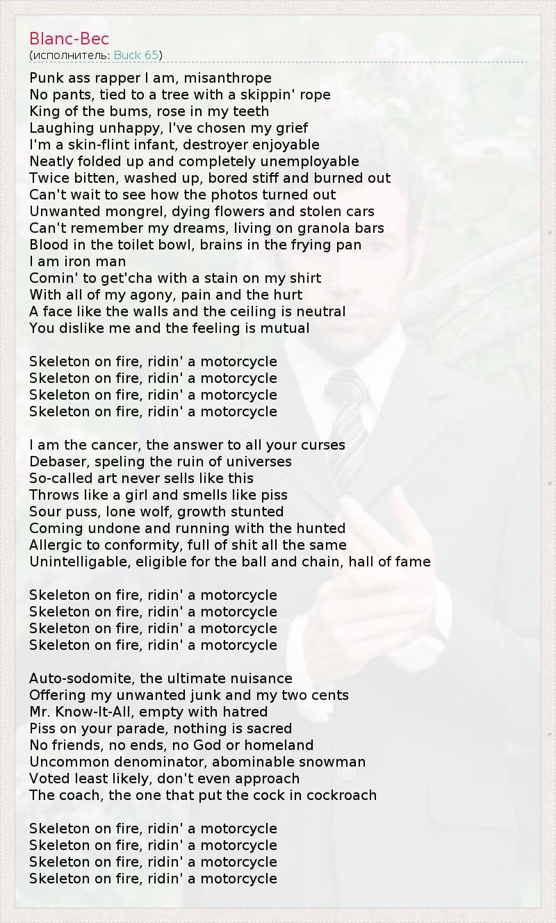 Это интересно:Richard Terfry (родился 4 марта 1972-го года), более известный под именем Buck 65 - легенда канадского хип-хопа. Его роль в развитии современной хип-хоп музыки сложно переоценить. Он стал одним из создетелей современного альтернативного и экспериментального хип-хопа. К тому же его эксперименты уходят далеко за пределы хип-хопа. Он экспериментирует с блюзом, кантри, роком, фолком и авангардом.Детство... продолжение