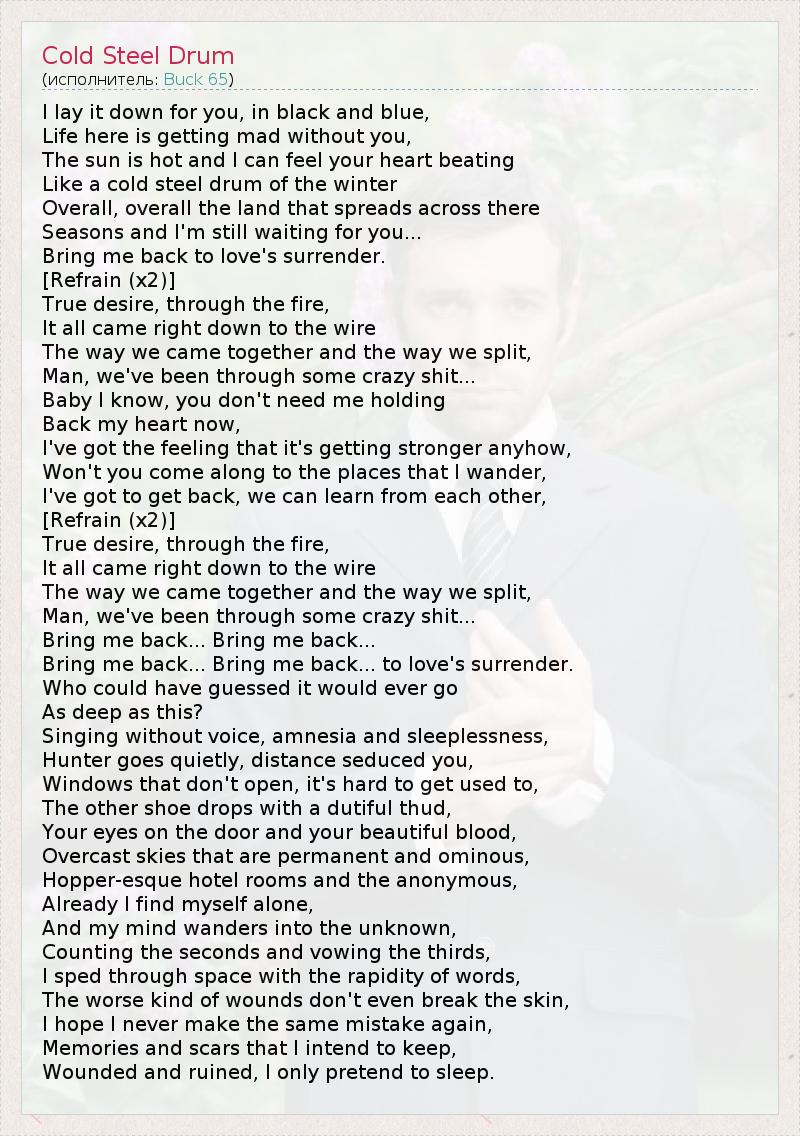 I lay it down for you, in black and blue, Life here is getting mad without you, The sun is hot and I can feel your heart beating Like a cold steel drum of the winter Overall, overall the land that spreads across there Seasons and I'm still waiting for you... Bring me back to love's surrender. [Refrain (x2)] True desire, through the fire, It all came right down to the wire The way we came together and the way we split, Man, we've been through some crazy shit... Baby I know, you don't need me holding Back my heart now, I've got the feeling that it's getting stronger anyhow, Won't you come along to the places that I wander, I've got to get back, we can learn from each other, [Refrain (x2)] True desire, through the fire, It all came right down to the wire The way we came together and the way we split, Man, we've been through some crazy shit... Bring me back... Bring me back... Bring me back... Bring me back... to love's surrender. Who could have guessed it would ever go As deep as this? Singing without voice, amnesia and sleeplessness, Hunter goes quietly, distance seduced you, Windows that don't open, it's hard to get used to, The other shoe drops with a dutiful thud, Your eyes on the door and your beautiful blood, Overcast skies that are permanent and ominous, Hopper-esque hotel rooms and the anonymous, Already I find myself alone, And my mind wanders into the unknown, Counting the seconds and vowing the thirds, I sped through space with the rapidity of words, The worse kind of wounds don't even break the skin, I hope I never make the same mistake again, Memories and scars that I intend to keep, Wounded and ruined, I only pretend to sleep.