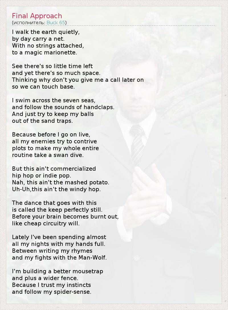Это интересно:Richard Terfry (родился 4 марта 1972-го года), более известный под именем Buck 65 - легенда канадского хип-хопа. Его роль в развитии современной хип-хоп музыки сложно переоценить. Он стал одним из создетелей современного альтернативного и экспериментального хип-хопа. К тому же его эксперименты уходят далеко за пределы хип-хопа. Он экспериментирует с блюзом, кантри, роком, фолком и авангардом.Детство... продолжение
