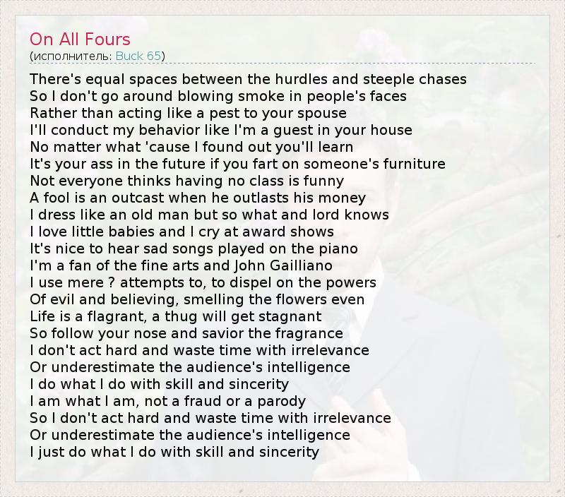 Это интересно:Richard Terfry (родился 4 марта 1972-го года), более известный под именем Buck 65 - легенда канадского хип-хопа. Его роль в развитии современной хип-хоп музыки сложно переоценить. Он стал одним из создетелей современного альтернативного и экспериментального хип-хопа. К тому же его эксперименты уходят далеко за пределы хип-хопа. Он экспериментирует с блюзом, кантри, роком, фолком и авангардом.Детство... продолжение