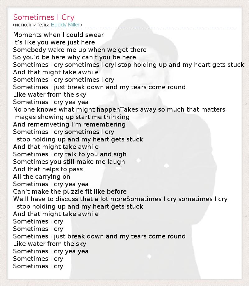 Moments when I could swear It's like you were just here Somebody wake me up when we get there So you'd be here why can't you be here Sometimes I cry sometimes I cryI stop holding up and my heart gets stuck And that might take awhile Sometimes I cry sometimes I cry Sometimes I just break down and my tears come round Like water from the sky Sometimes I cry yea yea No one knows what might happenTakes away so much that matters Images showing up start me thinking And rememveting I'm remembering Sometimes I cry sometimes I cry I stop holding up and my heart gets stuck And that might take awhile Sometimes I cry talk to you and sigh Sometimes you still make me laugh And that helps to pass All the carrying on Sometimes I cry yea yea Can't make the puzzle fit like before We'll have to discuss that a lot moreSometimes I cry sometimes I cry I stop holding up and my heart gets stuck And that might take awhile Sometimes I cry Sometimes I cry Sometimes I just break down and my tears come round Like water from the sky Sometimes I cry yea yea Sometimes I cry Sometimes I cry