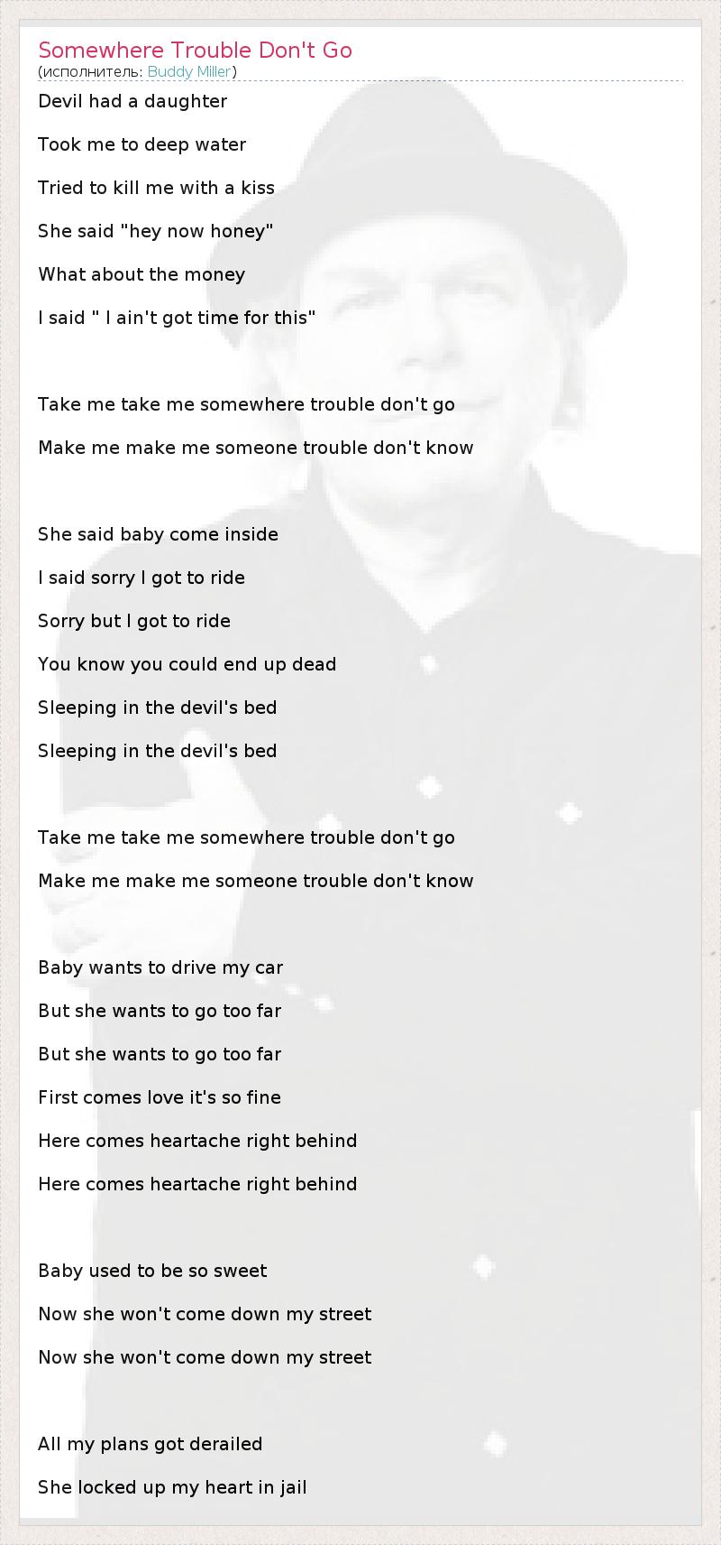 Devil had a daughter Took me to deep water Tried to kill me with a kiss She said "hey now honey" What about the money I said " I ain't got time for this" Take me take me somewhere trouble don't go Make me make me someone trouble don't know She said baby come inside I said sorry I got to ride Sorry but I got to ride You know you could end up dead Sleeping in the devil's bed Sleeping in the devil's bed Take me take me somewhere trouble don't go Make me make me someone trouble don't know Baby wants to drive my car But she wants to go too far But she wants to go too far First comes love it's so fine Here comes heartache right behind Here comes heartache right behind Baby used to be so sweet Now she won't come down my street Now she won't come down my street All my plans got derailed She locked up my heart in jail