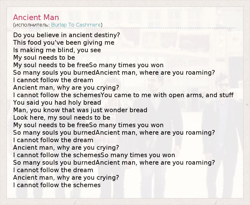 Do you believe in ancient destiny? This food you've been giving me Is making me blind, you see My soul needs to be My soul needs to be freeSo many times you won So many souls you burnedAncient man, where are you roaming? I cannot follow the dream Ancient man, why are you crying? I cannot follow the schemesYou came to me with open arms, and stuff You said you had holy bread Man, you know that was just wonder bread Look here, my soul needs to be My soul needs to be freeSo many times you won So many souls you burnedAncient man, where are you roaming? I cannot follow the dream Ancient man, why are you crying? I cannot follow the schemesSo many times you won So many souls you burnedAncient man, where are you roaming? I cannot follow the dream Ancient man, why are you crying? I cannot follow the schemes