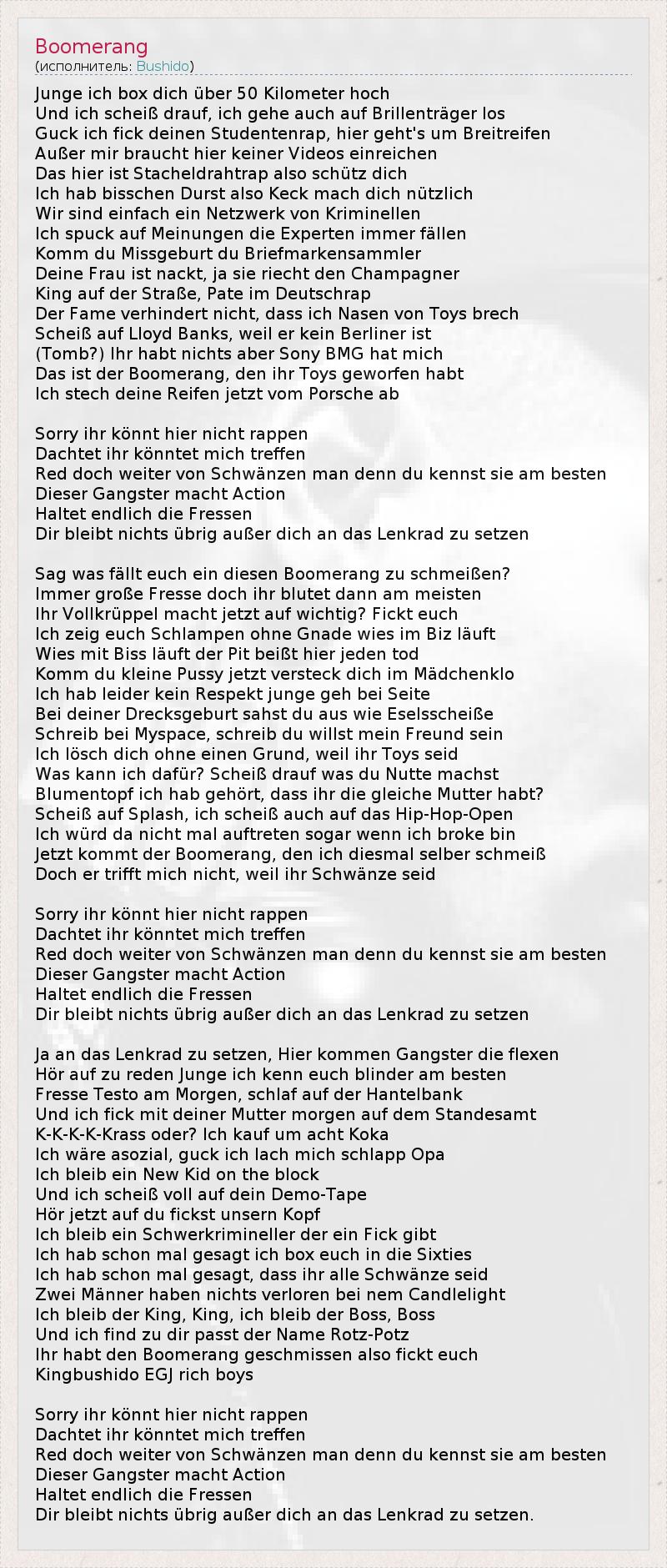 Junge ich box dich über 50 Kilometer hoch Und ich scheiß drauf, ich gehe auch auf Brillenträger los Guck ich fick deinen Studentenrap, hier geht's um Breitreifen Außer mir braucht hier keiner Videos einreichen Das hier ist Stacheldrahtrap also schütz dich Ich hab bisschen Durst also Keck mach dich nützlich Wir sind einfach ein Netzwerk von Kriminellen Ich spuck auf Meinungen die Experten immer fällen Komm du Missgeburt du Briefmarkensammler Deine Frau ist nackt, ja sie riecht den Champagner King auf der Straße, Pate im Deutschrap Der Fame verhindert nicht, dass ich Nasen von Toys brech Scheiß auf Lloyd Banks, weil er kein Berliner ist (Tomb?) Ihr habt nichts aber Sony BMG hat mich Das ist der Boomerang, den ihr Toys geworfen habt Ich stech deine Reifen jetzt vom Porsche ab Sorry ihr könnt hier nicht rappen Dachtet ihr könntet mich treffen Red doch weiter von Schwänzen man denn du kennst sie am besten Dieser Gangster macht Action Haltet endlich die Fressen Dir bleibt nichts übrig außer dich an das Lenkrad zu setzen Sag was fällt euch ein diesen Boomerang zu schmeißen? Immer große Fresse doch ihr blutet dann am meisten Ihr Vollkrüppel macht jetzt auf wichtig? Fickt euch Ich zeig euch Schlampen ohne Gnade wies im Biz läuft Wies mit Biss läuft der Pit beißt hier jeden tod Komm du kleine Pussy jetzt versteck dich im Mädchenklo Ich hab leider kein Respekt junge geh bei Seite Bei deiner Drecksgeburt sahst du aus wie Eselsscheiße Schreib bei Myspace, schreib du willst mein Freund sein Ich lösch dich ohne einen Grund, weil ihr Toys seid Was kann ich dafür? Scheiß drauf was du Nutte machst Blumentopf ich hab gehört, dass ihr die gleiche Mutter habt? Scheiß auf Splash, ich scheiß auch auf das Hip-Hop-Open Ich würd da nicht mal auftreten sogar wenn ich broke bin Jetzt kommt der Boomerang, den ich diesmal selber schmeiß Doch er trifft mich nicht, weil ihr Schwänze seid Sorry ihr könnt hier nicht rappen Dachtet ihr könntet mich treffen Red doch weiter von Schwänzen man denn du kennst sie am besten Dieser Gangster macht Action Haltet endlich die Fressen Dir bleibt nichts übrig außer dich an das Lenkrad zu setzen Ja an das Lenkrad zu setzen, Hier kommen Gangster die flexen Hör auf zu reden Junge ich kenn euch blinder am besten Fresse Testo am Morgen, schlaf auf der Hantelbank Und ich fick mit deiner Mutter morgen auf dem Standesamt K-K-K-K-Krass oder? Ich kauf um acht Koka Ich wäre asozial, guck ich lach mich schlapp Opa Ich bleib ein New Kid on the block Und ich scheiß voll auf dein Demo-Tape Hör jetzt auf du fickst unsern Kopf Ich bleib ein Schwerkrimineller der ein Fick gibt Ich hab schon mal gesagt ich box euch in die Sixties Ich hab schon mal gesagt, dass ihr alle Schwänze seid Zwei Männer haben nichts verloren bei nem Candlelight Ich bleib der King, King, ich bleib der Boss, Boss Und ich find zu dir passt der Name Rotz-Potz Ihr habt den Boomerang geschmissen also fickt euch Kingbushido EGJ rich boys Sorry ihr könnt hier nicht rappen Dachtet ihr könntet mich treffen Red doch weiter von Schwänzen man denn du kennst sie am besten Dieser Gangster macht Action Haltet endlich die Fressen Dir bleibt nichts übrig außer dich an das Lenkrad zu setzen.