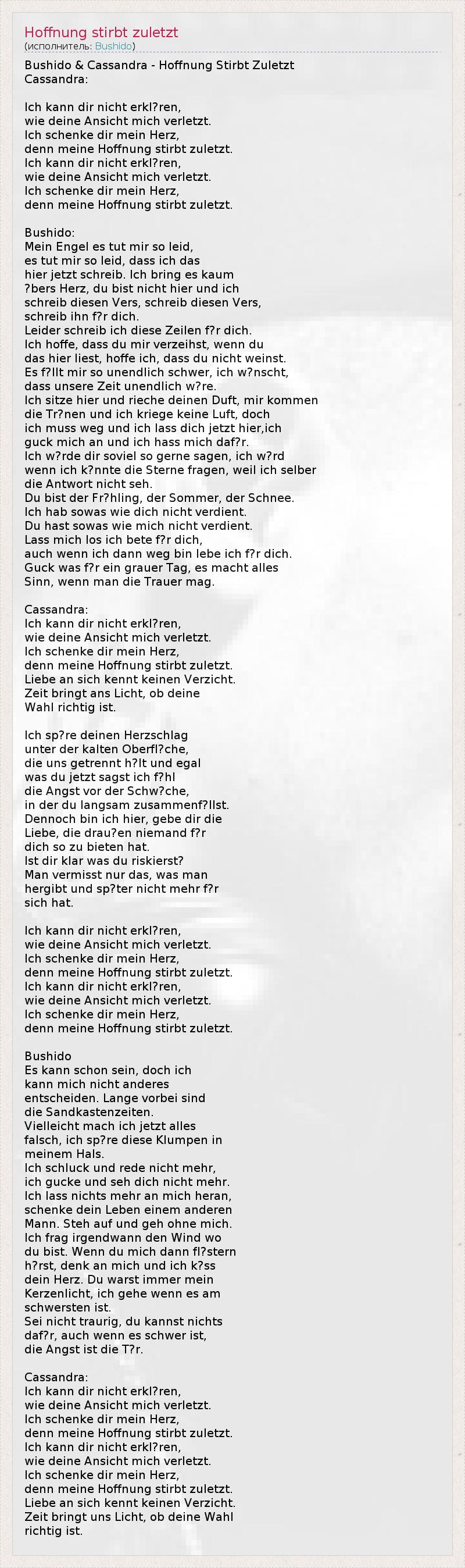 Bushido & Cassandra - Hoffnung Stirbt Zuletzt Cassandra: Ich kann dir nicht erkl?ren, wie deine Ansicht mich verletzt. Ich schenke dir mein Herz, denn meine Hoffnung stirbt zuletzt. Ich kann dir nicht erkl?ren, wie deine Ansicht mich verletzt. Ich schenke dir mein Herz, denn meine Hoffnung stirbt zuletzt. Bushido: Mein Engel es tut mir so leid, es tut mir so leid, dass ich das hier jetzt schreib. Ich bring es kaum ?bers Herz, du bist nicht hier und ich schreib diesen Vers, schreib diesen Vers, schreib ihn f?r dich. Leider schreib ich diese Zeilen f?r dich. Ich hoffe, dass du mir verzeihst, wenn du das hier liest, hoffe ich, dass du nicht weinst. Es f?llt mir so unendlich schwer, ich w?nscht, dass unsere Zeit unendlich w?re. Ich sitze hier und rieche deinen Duft, mir kommen die Tr?nen und ich kriege keine Luft, doch ich muss weg und ich lass dich jetzt hier,ich guck mich an und ich hass mich daf?r. Ich w?rde dir soviel so gerne sagen, ich w?rd wenn ich k?nnte die Sterne fragen, weil ich selber die Antwort nicht seh. Du bist der Fr?hling, der Sommer, der Schnee. Ich hab sowas wie dich nicht verdient. Du hast sowas wie mich nicht verdient. Lass mich los ich bete f?r dich, auch wenn ich dann weg bin lebe ich f?r dich. Guck was f?r ein grauer Tag, es macht alles Sinn, wenn man die Trauer mag. Cassandra: Ich kann dir nicht erkl?ren, wie deine Ansicht mich verletzt. Ich schenke dir mein Herz, denn meine Hoffnung stirbt zuletzt. Liebe an sich kennt keinen Verzicht. Zeit bringt ans Licht, ob deine Wahl richtig ist. Ich sp?re deinen Herzschlag unter der kalten Oberfl?che, die uns getrennt h?lt und egal was du jetzt sagst ich f?hl die Angst vor der Schw?che, in der du langsam zusammenf?llst. Dennoch bin ich hier, gebe dir die Liebe, die drau?en niemand f?r dich so zu bieten hat. Ist dir klar was du riskierst? Man vermisst nur das, was man hergibt und sp?ter nicht mehr f?r sich hat. Ich kann dir nicht erkl?ren, wie deine Ansicht mich verletzt. Ich schenke dir mein Herz, denn meine Hoffnung stirbt zuletzt. Ich kann dir nicht erkl?ren, wie deine Ansicht mich verletzt. Ich schenke dir mein Herz, denn meine Hoffnung stirbt zuletzt. Bushido Es kann schon sein, doch ich kann mich nicht anderes entscheiden. Lange vorbei sind die Sandkastenzeiten. Vielleicht mach ich jetzt alles falsch, ich sp?re diese Klumpen in meinem Hals. Ich schluck und rede nicht mehr, ich gucke und seh dich nicht mehr. Ich lass nichts mehr an mich heran, schenke dein Leben einem anderen Mann. Steh auf und geh ohne mich. Ich frag irgendwann den Wind wo du bist. Wenn du mich dann fl?stern h?rst, denk an mich und ich k?ss dein Herz. Du warst immer mein Kerzenlicht, ich gehe wenn es am schwersten ist. Sei nicht traurig, du kannst nichts daf?r, auch wenn es schwer ist, die Angst ist die T?r. Cassandra: Ich kann dir nicht erkl?ren, wie deine Ansicht mich verletzt. Ich schenke dir mein Herz, denn meine Hoffnung stirbt zuletzt. Ich kann dir nicht erkl?ren, wie deine Ansicht mich verletzt. Ich schenke dir mein Herz, denn meine Hoffnung stirbt zuletzt. Liebe an sich kennt keinen Verzicht. Zeit bringt uns Licht, ob deine Wahl richtig ist.