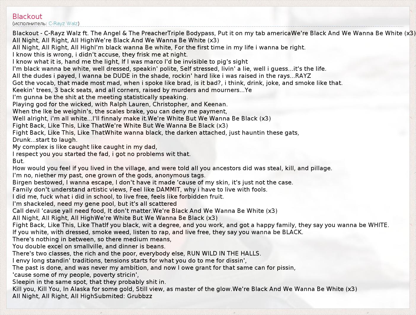 Blackout - C-Rayz Walz ft. The Angel & The PreacherTriple Bodypass, Put it on my tab americaWe're Black And We Wanna Be White (x3)