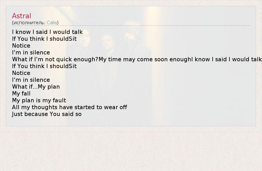 I know I said I would talk If You think I shouldSit Notice I'm in silence What if I'm not quick enough?My time may come soon enoughI know I said I would talk If You think I shouldSit Notice I'm in silence What if...My plan My fall My plan is my fault All my thoughts have started to wear off Just because You said so
