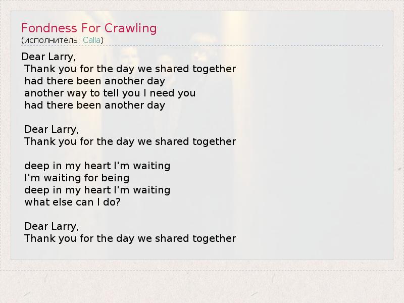 Dear Larry, Thank you for the day we shared together had there been another day another way to tell you I need you had there been another day Dear Larry, Thank you for the day we shared together deep in my heart I'm waiting I'm waiting for being deep in my heart I'm waiting what else can I do? Dear Larry, Thank you for the day we shared together