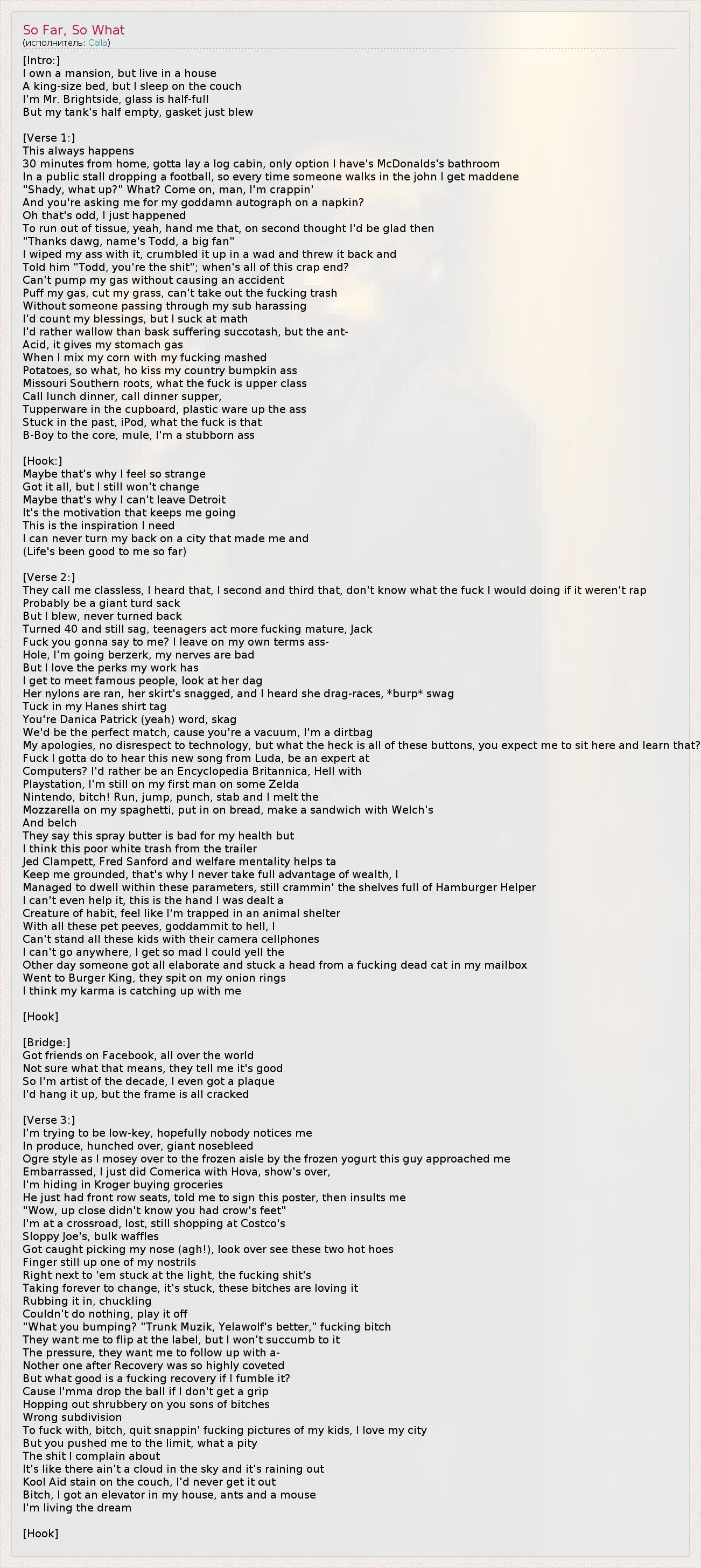 [Вступление:] Владею поместьем, но живу в доме. Кровать, как у короля, но сплю на диване. Я - Мистер Оптимист, у которого стакан наполовину полон, 1 Но мой бак наполовину пустой, я без тормозов. 2 [Куплет 1:] Так бывает всегда, В 30 минутах от дома, как приспичит накласть кирпичи, 3 что единственный вариант — туалет в Макдональдс. В общественной кабине, выталкивая футбольные мячи, 4 каждый раз кто-то шорхается в сортире, а меня это бесит. "Шейди, че как?" - Что? Парень, брось, я же сру, А ты просишь мой чертов автограф на салфетке? О, странно, у меня как раз случайно Кончилась бумажка, 5 да, передай мне салфетку, задней мыслью я был бы ей рад. "Спасибо, чувак, меня зовут Тодд, я твой большой фанат". Я подтер ею свой зад, скомкал и выбросил, а Ему сказал: "Тодд, ты г*вно"; когда же кончится такое дер*мо? 6 Не могу заправить машину, не вызвав ДТП. Не могу спокойно пердануть, 7 подстричь газон, вынести е*учий мусор, Без кого-то, кто проходит мимо, раздражая меня. Я бы посчитал свои благословения, но у меня с математикой х*ево. 8 Я лучше буду спокойно лежать, чем греться в лучах славы, 9 чертова варенная кукуруза, но анта- Циды 10 пучат мой живот, Когда я смешиваю кукурузу со своим греб*нным Пюре, ну и что? Эй, поцелуй мой колхозный зад. Я родом из Южного Миссури, 11 что такое высшее общество, бл*дь? Зову полдник обедом, а обед — ужином, 12 Таппервэа 13 в шкафе для посуды, пластика хоть жопой жри, Застрял в прошлом: АйПод? Что это за х*йня? 14 Брейкдансер до мозга костей, я упрямый ослиный зад. [Припев:] Может, поэтому у меня странное ощущение. Все есть, но я по-прежнему не изменился. Может, поэтому я не могу уехать из Детройта. Вот что мотивирует меня, стимулирует. Дает необходимое вдохновение. Я никогда не смогу повернуться спиной к городу, сделавшему меня 15 и (Жизнь была ко мне добра до этих пор) 16 [Куплет 2:] Меня называют неформалом, 17 слышал, соглашусь хоть трижды с этим и я не знаю, что бы делал, не будь рэпа. Возможно, был бы гигантским мешком с дерьмом. Но я выстрелил 18 и впредь не вернусь назад. Мне стукнуло 40, штаны до сих пор висят, 19 а подростки выглядят бл*дь взрослее, Джек. 20 Еб*ть, хочешь мне что-то предъявить? Я живу на своих условиях, ты жопа С ручками, я вышел из себя, как берсеркер, 21 мои нервишки шалят, Но я люблю льготы от своей работы. Так я познакомился с известными людьми, посмотри на нее, ого! По ее нейлону прошла стрелка, юбка застряла, я слышал, что она автогонщица, *отрыжка*, круто. 22 Запала на мою рубашку из Хейнс. 23 Ты Даника Патрик (точняк) другими словами — красивая, как кобыла сивая. 24 Мы бы идеально друг другу подошли, ведь ты как пылесоска, а я мусорный мешок. 25 Извиняюсь, 26 при всем уважении к технологиям, что за черт все эти кнопки, думаете я буду сидеть и учить их? 27 Бл*дь, мне что нужно взять да послушать ту новую тему Луды, чтобы стать спецом в Компах? 28 Я лучше буду Британской энциклопедией. 29 К черту Плейстейшен, я до сих пор с одной жизнью в какой-нибудь Зельде от Нинтендо, с*ка! 30 Бегаю, прыгаю, скачу, колочу 31 и плавлю Моцареллу 32 в спагетти, ложу на хлеб, делаю бутерброды с вареньем, запиваю Велчем И отрыгиваюсь. 33 Говорят жир опасен для здоровья, но Я думаю, что для белого бедняка и отброса из трейлера - Джед Клампетт, 34 Фред Сэнфорд 35 и иждивенческая психология помогают Быть приземленным, 36 поэтому я никогда по-полной не пользовался богатством, мне Удалось остановиться в указных выше ра