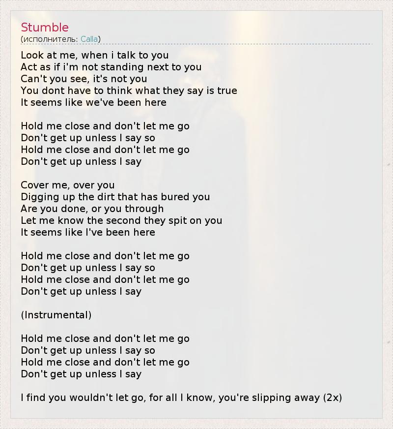 Look at me, when i talk to you Act as if i'm not standing next to you Can't you see, it's not you You dont have to think what they say is true It seems like we've been here Hold me close and don't let me go Don't get up unless I say so Hold me close and don't let me go Don't get up unless I say Cover me, over you Digging up the dirt that has bured you Are you done, or you through Let me know the second they spit on you It seems like I've been here Hold me close and don't let me go Don't get up unless I say so Hold me close and don't let me go Don't get up unless I say (Instrumental) Hold me close and don't let me go Don't get up unless I say so Hold me close and don't let me go Don't get up unless I say I find you wouldn't let go, for all I know, you're slipping away (2x)