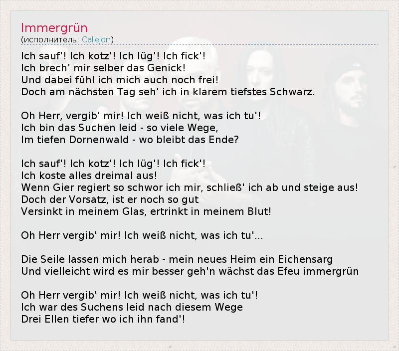 Я пью, я блюю, я вру, я тр***юсь! Я сам себе ломаю шею И при этом чувствую себя свободным, Но на следующий день я смотрю в чистую темнейшую черноту. О господь, прости меня! Я не знаю, что творю! Я сожалею об исканиях, так много дорог В глубоком тернистом лесу, где остался конец? Я пью, я блюю, я вру, я тр***юсь! Я наслаждаюсь всем трижды! Когда меня одолеет жажда, я поклялся себе, я запру ее и откажусь, Но намерение, пусть и хорошее, Утопает в моем бокале, тонет в моей крови. О господь, прости меня! Я не знаю, что творю... Веревки опускают меня, мой новый дом – дубовый гроб, И возможно, мне станет лучше, когда вырастет вечнозеленый плющ. О господь, прости меня! Я не знаю, что творю! Я сожалею, что искал этот путь, На глубине трех локтей, где я нашел его.
