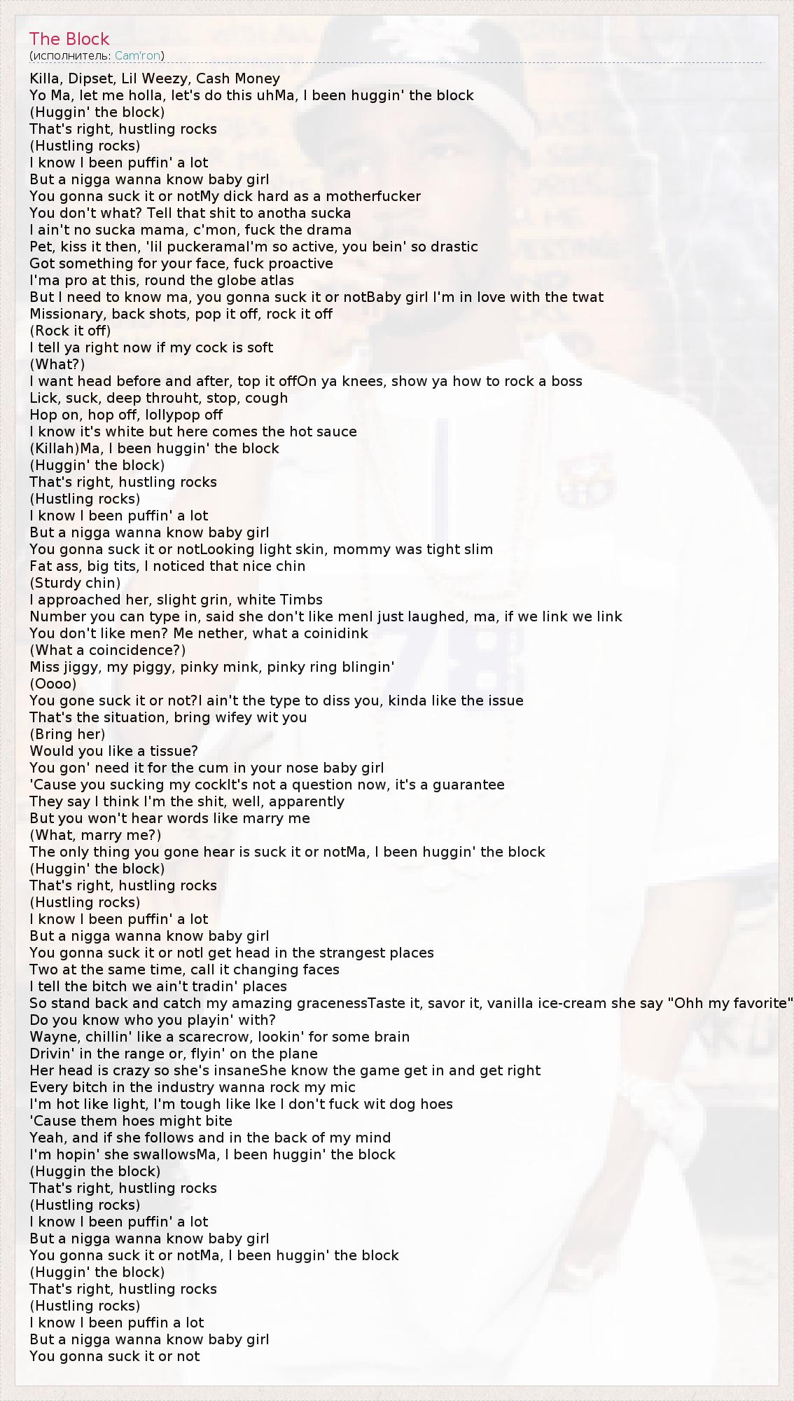 I'm hopin' she swallowsMa, I been huggin' the block