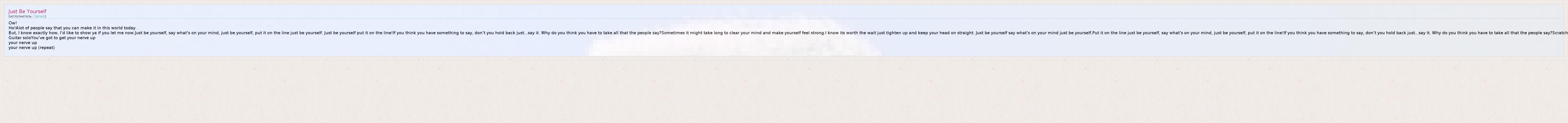 But, I know exactly how, I'd like to show ya if you let me now.Just be yourself, say what's on your mind, just be yourself, put it on the line just be yourself. Just be yourself put it on the line!If you think you have something to say, don't you hold back just...say it. Why do you think you have to take all that the people say?Sometimes it might take long to clear your mind and make yourself feel strong.I know its worth the wait just tighten up and keep your head on straight. Just be yourself say what's on your mind just be yourself.Put it on the line just be yourself, say what's on your mind, just be yourself, put it on the line!If you think you have something to say, don't you hold back just...say it. Why do you think you have to take all that the people say?Scratch
