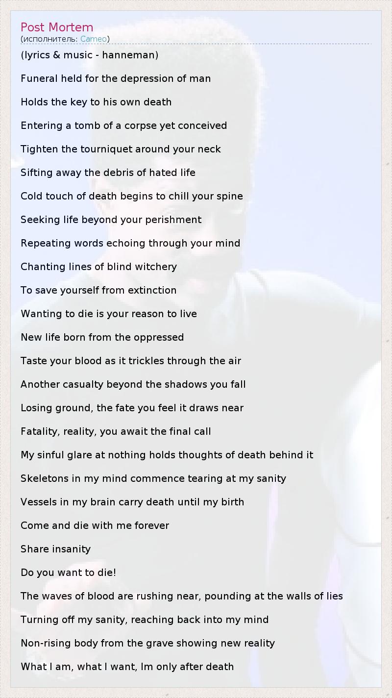 Похороны вгоняют в депрессию человека Храня тайну его собственной смерти Труп, что опускается в могилу, успел прочувствовать Как удавка затягивалась вокруг вашей шеи Отметаются осколки ненавистной жизни Холодное прикосновение смерти холодит вашу спину В поисках жизни за пределами вашей бренности Повторяете слова отзывающиеся эхом в вашем сознании Поете строчки слепого очарования Чтобы спаси себя от вымирания Жажда смерти – объяснение вашей жизни Новая жизнь – порождение Угнетенных Вкусите собственную кровь, когда она струится на воздухе Вы очередная жертва, гибель вдали от мира Земля уходит из-под ног, свершится ваша участь Обреченность, реальность, вы на пороге смерти Мой порочный глянец не может скрыть мыслей о смерти Скелеты в моем сознании прорываются к моему здравомыслию Сосуды в моем мозгу несут смерть до моего рождения Давайте, умрите со мной навечно Разделите безумие Хотите ли вы умереть?! Кровь накатывает волнами, они бьются о стенки лжи Отключают мое сознание, возвращаясь в мой разум Погребенный труп показывает из могилы новую реальность Что я есть, что я хочу, я оживаю только после смерти