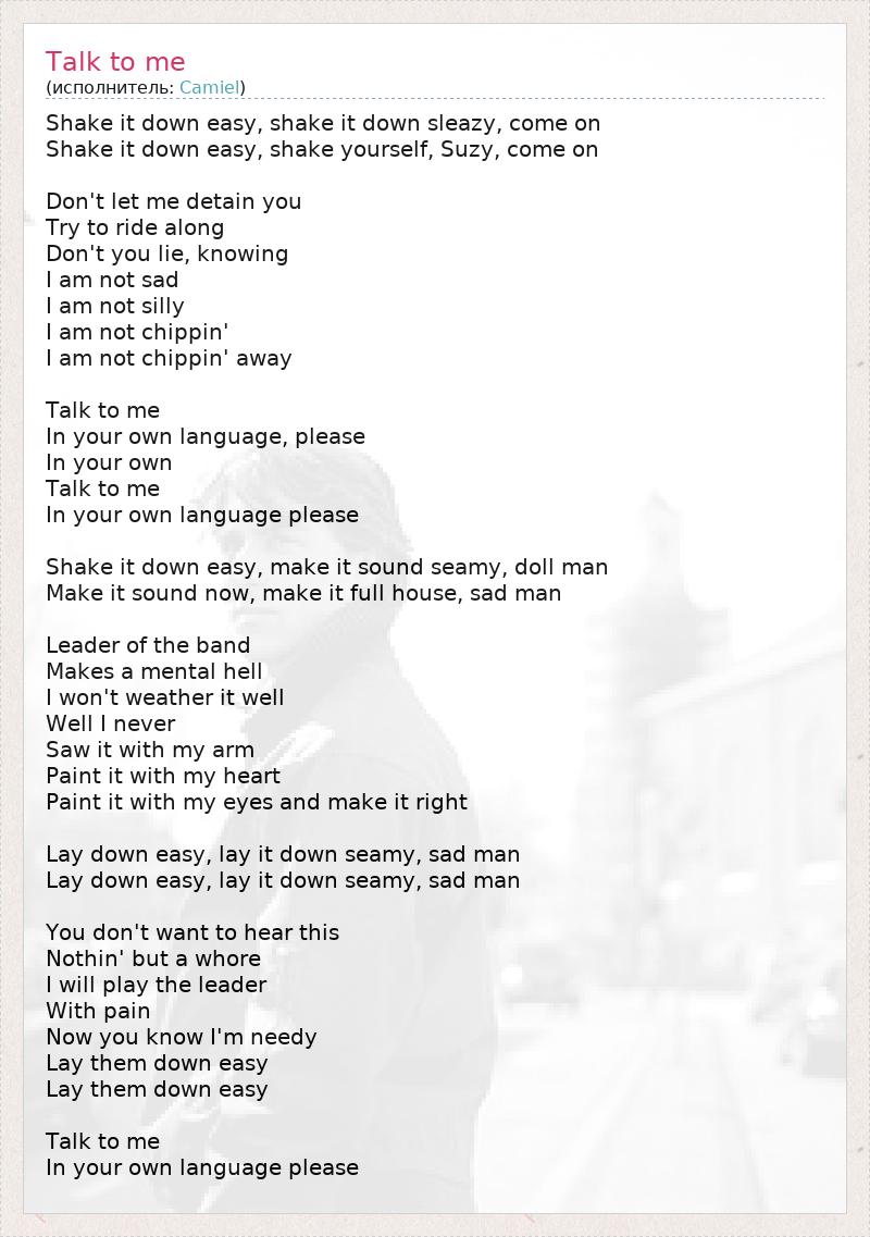 Shake it down easy, shake it down sleazy, come on Shake it down easy, shake yourself, Suzy, come on Don't let me detain you Try to ride along Don't you lie, knowing I am not sad I am not silly I am not chippin' I am not chippin' away Talk to me In your own language, please In your own Talk to me In your own language please Shake it down easy, make it sound seamy, doll man Make it sound now, make it full house, sad man Leader of the band Makes a mental hell I won't weather it well Well I never Saw it with my arm Paint it with my heart Paint it with my eyes and make it right Lay down easy, lay it down seamy, sad man Lay down easy, lay it down seamy, sad man You don't want to hear this Nothin' but a whore I will play the leader With pain Now you know I'm needy Lay them down easy Lay them down easy Talk to me In your own language please
