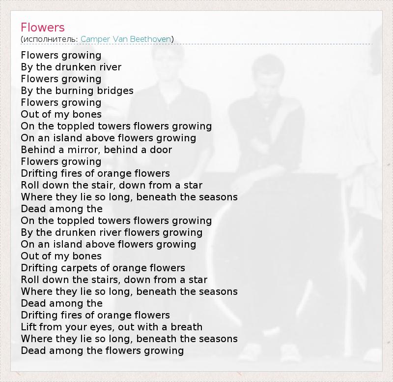 Flowers growing By the drunken river Flowers growing By the burning bridges Flowers growing Out of my bones On the toppled towers flowers growing On an island above flowers growing Behind a mirror, behind a door Flowers growing Drifting fires of orange flowers Roll down the stair, down from a star Where they lie so long, beneath the seasons Dead among the On the toppled towers flowers growing By the drunken river flowers growing On an island above flowers growing Out of my bones Drifting carpets of orange flowers Roll down the stairs, down from a star Where they lie so long, beneath the seasons Dead among the Drifting fires of orange flowers Lift from your eyes, out with a breath Where they lie so long, beneath the seasons Dead among the flowers growing