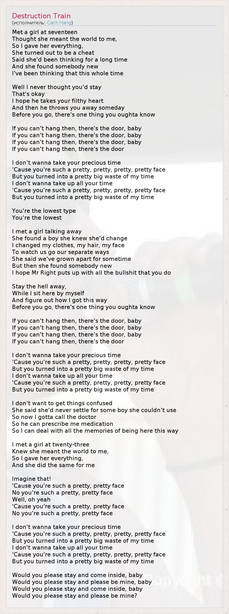 Met a girl at seventeen Thought she meant the world to me, So I gave her everything, She turned out to be a cheat Said she'd been thinking for a long time And she found somebody new I've been thinking that this whole time Well I never thought you'd stay That's okay I hope he takes your filthy heart And then he throws you away someday Before you go, there's one thing you oughta know If you can't hang then, there's the door, baby If you can't hang then, there's the door, baby If you can't hang then, there's the door, baby If you can't hang then, there's the door I don't wanna take your precious time 'Cause you're such a pretty, pretty, pretty, pretty face But you turned into a pretty big waste of my time I don't wanna take up all your time 'Cause you're such a pretty, pretty, pretty, pretty face But you turned into a pretty big waste of my time You're the lowest type You're the lowest I met a girl talking away She found a boy she knew she'd change I changed my clothes, my hair, my face To watch us go our separate ways She said we've grown apart for sometime But then she found somebody new I hope Mr Right puts up with all the bullshit that you do Stay the hell away, While I sit here by myself And figure out how I got this way Before you go, there's one thing you oughta know If you can't hang then, there's the door, baby If you can't hang then, there's the door, baby If you can't hang then, there's the door, baby If you can't hang then, there's the door I don't wanna take your precious time 'Cause you're such a pretty, pretty, pretty, pretty face But you turned into a pretty big waste of my time I don't wanna take up all your time 'Cause you're such a pretty, pretty, pretty, pretty face But you turned into a pretty big waste of my time I don't want to get things confused She said she'd never settle for some boy she couldn't use So now I gotta call the doctor So he can prescribe me medication So I can deal with all the memories of being here this way I met a girl at twenty-three Knew she meant the world to me, So I gave her everything, And she did the same for me Imagine that! 'Cause you're such a pretty, pretty face No you're such a pretty, pretty face Well, oh yeah 'Cause you're such a pretty, pretty face No you're such a pretty, pretty face I don't wanna take your precious time 'Cause you're such a pretty, pretty, pretty, pretty face But you turned into a pretty big waste of my time I don't wanna take up all your time 'Cause you're such a pretty, pretty, pretty, pretty face But you turned into a pretty big waste of my time Would you please stay and come inside, baby Would you please stay and please be mine, baby Would you please stay and come inside, baby Would you please stay and please be mine?