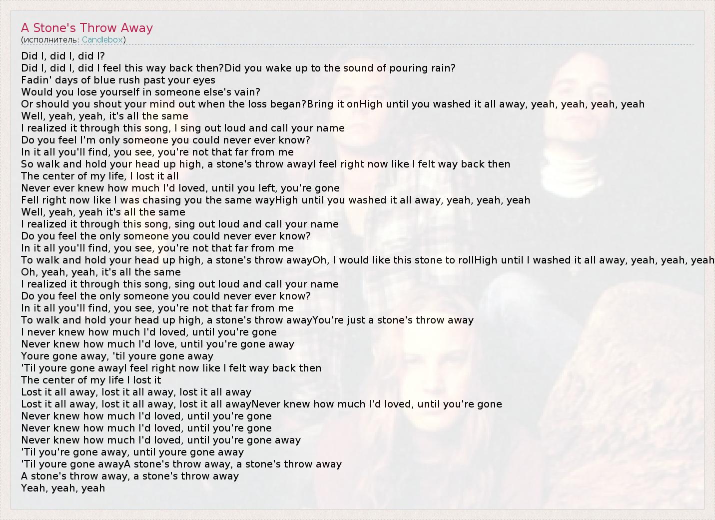 'Til youre gone awayA stone's throw away, a stone's throw away