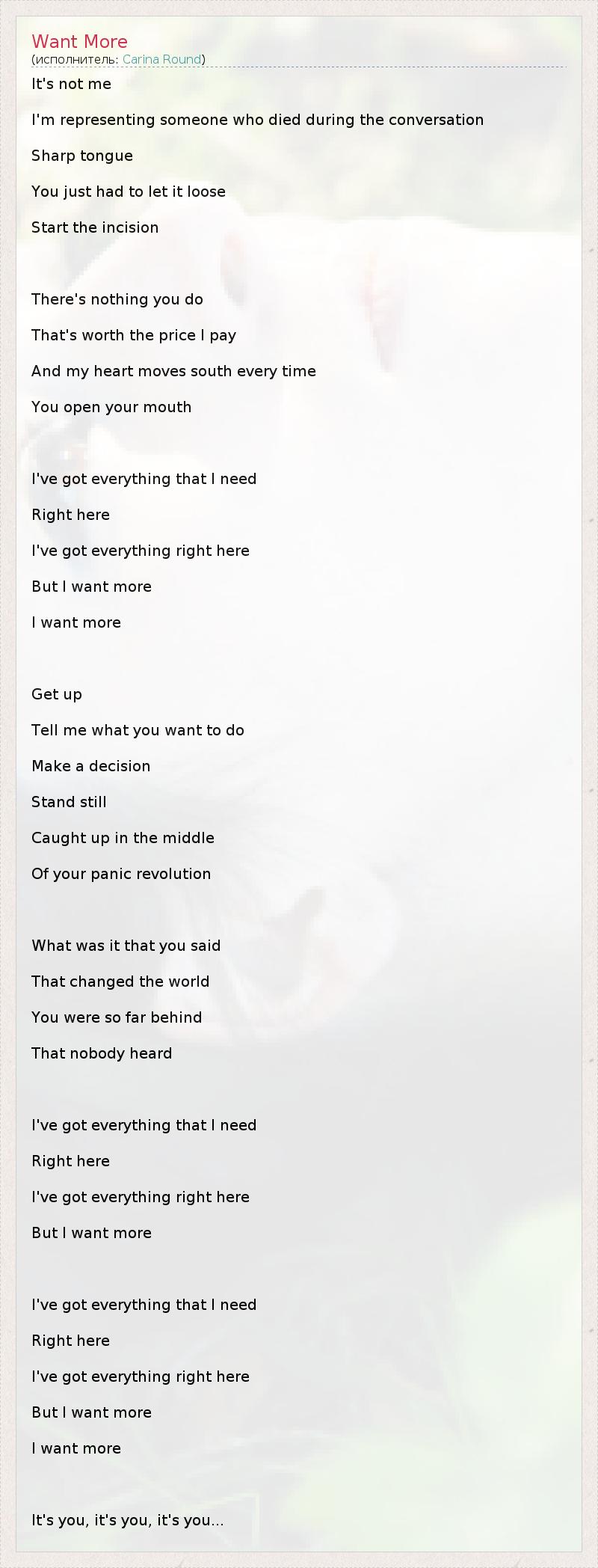 It's not me I'm representing someone who died during the conversation Sharp tongue You just had to let it loose Start the incision There's nothing you do That's worth the price I pay And my heart moves south every time You open your mouth I've got everything that I need Right here I've got everything right here But I want more I want more Get up Tell me what you want to do Make a decision Stand still Caught up in the middle Of your panic revolution What was it that you said That changed the world You were so far behind That nobody heard I've got everything that I need Right here I've got everything right here But I want more I've got everything that I need Right here I've got everything right here But I want more I want more It's you, it's you, it's you...
