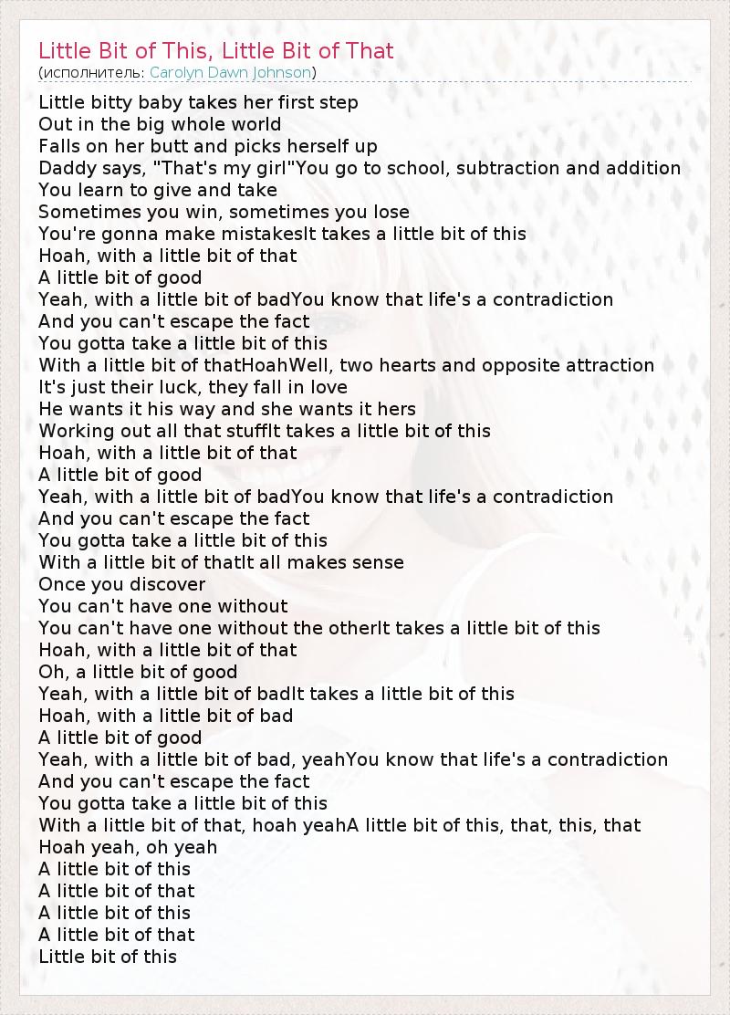 ГлавнаяИсполнителиCarolyn Dawn JohnsonLittle Bit of This, Little Bit of That