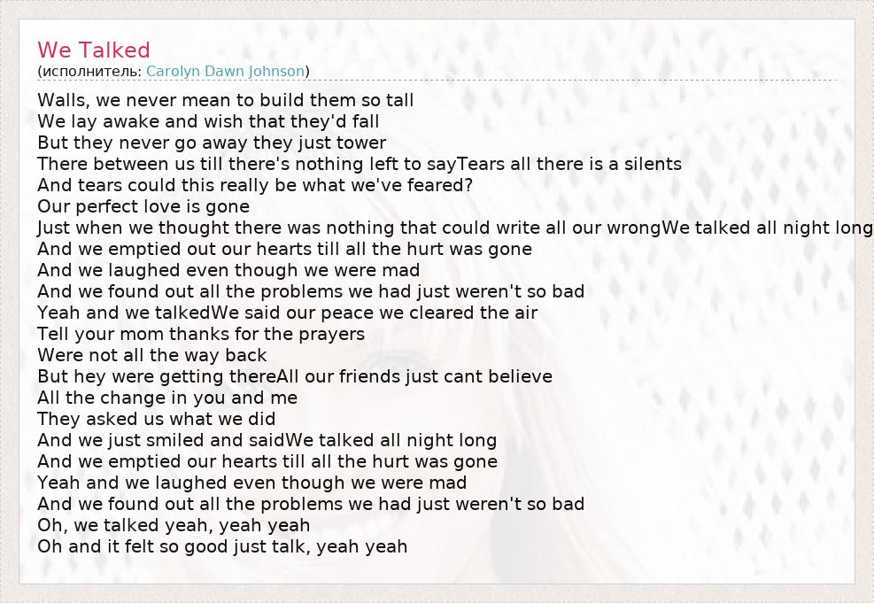 Walls, we never mean to build them so tall We lay awake and wish that they'd fall But they never go away they just tower There between us till there's nothing left to sayTears all there is a silents And tears could this really be what we've feared? Our perfect love is gone Just when we thought there was nothing that could write all our wrongWe talked all night long And we emptied out our hearts till all the hurt was gone And we laughed even though we were mad And we found out all the problems we had just weren't so bad Yeah and we talkedWe said our peace we cleared the air Tell your mom thanks for the prayers Were not all the way back But hey were getting thereAll our friends just cant believe All the change in you and me They asked us what we did And we just smiled and saidWe talked all night long And we emptied our hearts till all the hurt was gone Yeah and we laughed even though we were mad And we found out all the problems we had just weren't so bad Oh, we talked yeah, yeah yeah Oh and it felt so good just talk, yeah yeah