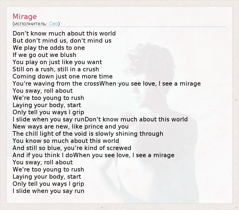 Don't know much about this world But don't mind us, don't mind us We play the odds to one If we go out we blush You play on just like you want Still on a rush, still in a crush Coming down just one more time You're waving from the crossWhen you see love, I see a mirage You sway, roll about We're too young to rush Laying your body, start Only tell you ways I grip I slide when you say runDon't know much about this world New ways are new, like prince and you The chill light of the void is slowly shining through You know so much about this world And still so blue, you're kind of screwed And if you think I doWhen you see love, I see a mirage You sway, roll about We're too young to rush Laying your body, start Only tell you ways I grip I slide when you say run
