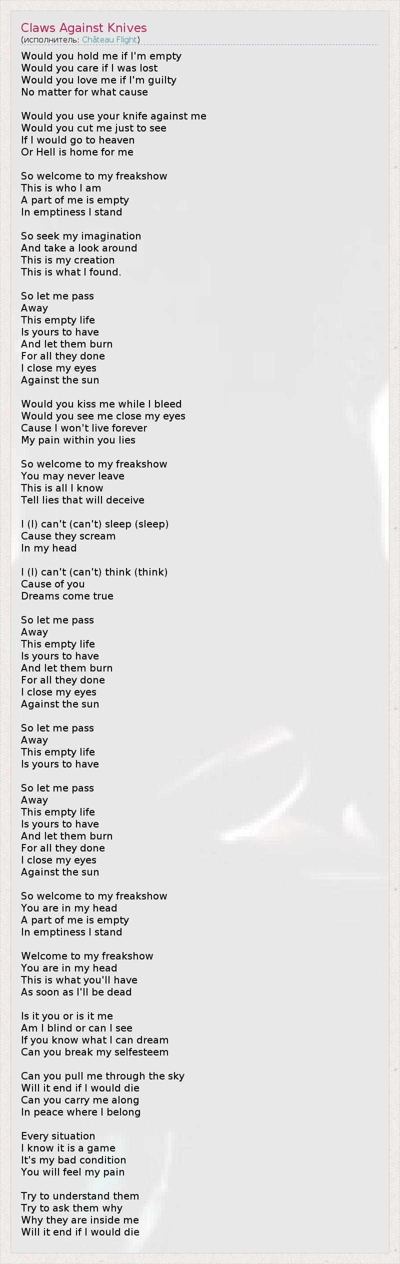 Would you hold me if I'm empty Would you care if I was lost Would you love me if I'm guilty No matter for what cause Would you use your knife against me Would you cut me just to see If I would go to heaven Or Hell is home for me So welcome to my freakshow This is who I am A part of me is empty In emptiness I stand So seek my imagination And take a look around This is my creation This is what I found. So let me pass Away This empty life Is yours to have And let them burn For all they done I close my eyes Against the sun Would you kiss me while I bleed Would you see me close my eyes Cause I won't live forever My pain within you lies So welcome to my freakshow You may never leave This is all I know Tell lies that will deceive I (I) can't (can't) sleep (sleep) Cause they scream In my head I (I) can't (can't) think (think) Cause of you Dreams come true So let me pass Away This empty life Is yours to have And let them burn For all they done I close my eyes Against the sun So let me pass Away This empty life Is yours to have So let me pass Away This empty life Is yours to have And let them burn For all they done I close my eyes Against the sun So welcome to my freakshow You are in my head A part of me is empty In emptiness I stand Welcome to my freakshow You are in my head This is what you'll have As soon as I'll be dead Is it you or is it me Am I blind or can I see If you know what I can dream Can you break my selfesteem Can you pull me through the sky Will it end if I would die Can you carry me along In peace where I belong Every situation I know it is a game It's my bad condition You will feel my pain Try to understand them Try to ask them why Why they are inside me Will it end if I would die