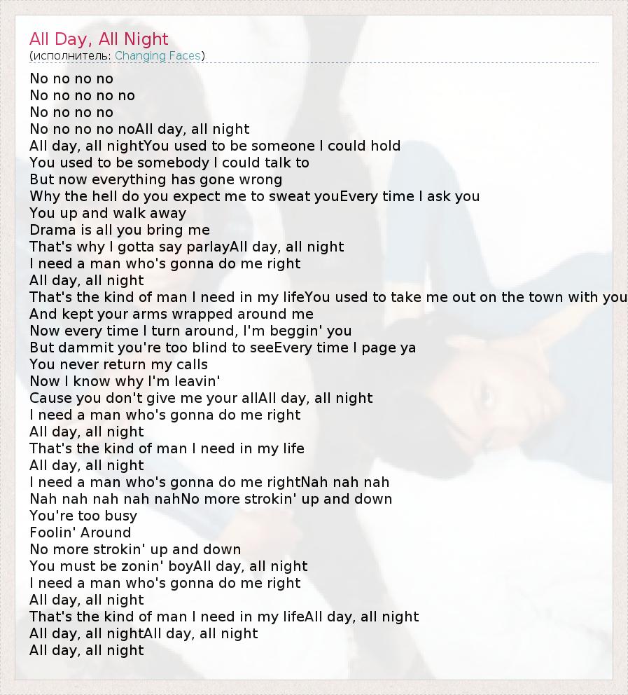 No no no no No no no no no No no no no No no no no noAll day, all night All day, all nightYou used to be someone I could hold You used to be somebody I could talk to But now everything has gone wrong Why the hell do you expect me to sweat youEvery time I ask you You up and walk away Drama is all you bring me That's why I gotta say parlayAll day, all night I need a man who's gonna do me right All day, all night That's the kind of man I need in my lifeYou used to take me out on the town with you And kept your arms wrapped around me Now every time I turn around, I'm beggin' you But dammit you're too blind to seeEvery time I page ya You never return my calls Now I know why I'm leavin' Cause you don't give me your allAll day, all night I need a man who's gonna do me right All day, all night That's the kind of man I need in my life All day, all night I need a man who's gonna do me rightNah nah nah Nah nah nah nah nahNo more strokin' up and down You're too busy Foolin' Around No more strokin' up and down You must be zonin' boyAll day, all night I need a man who's gonna do me right All day, all night That's the kind of man I need in my lifeAll day, all night All day, all nightAll day, all night All day, all night
